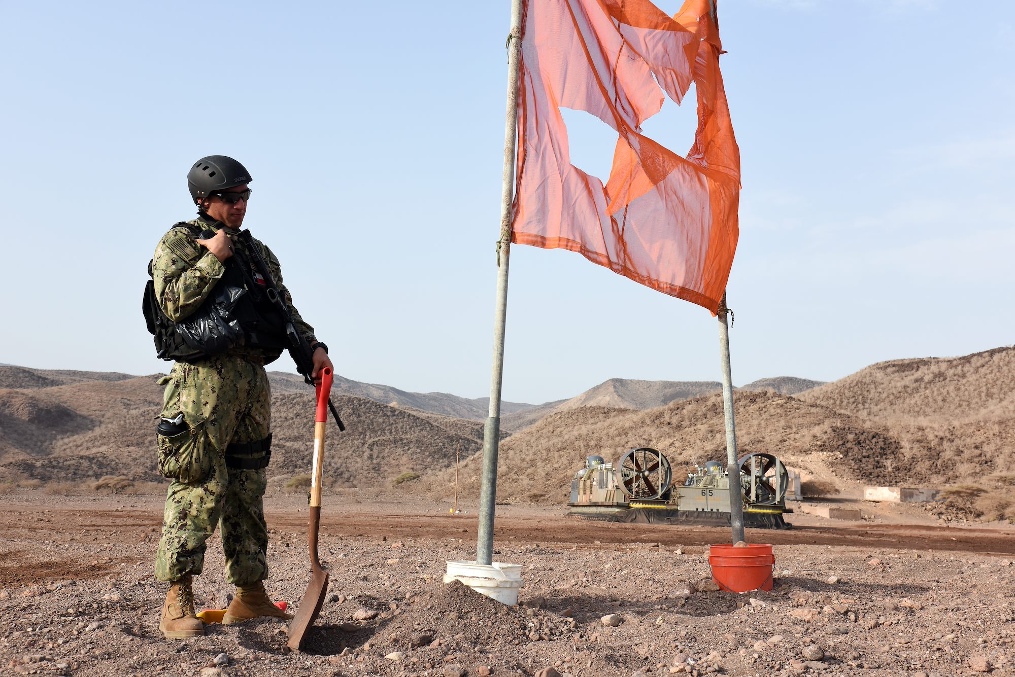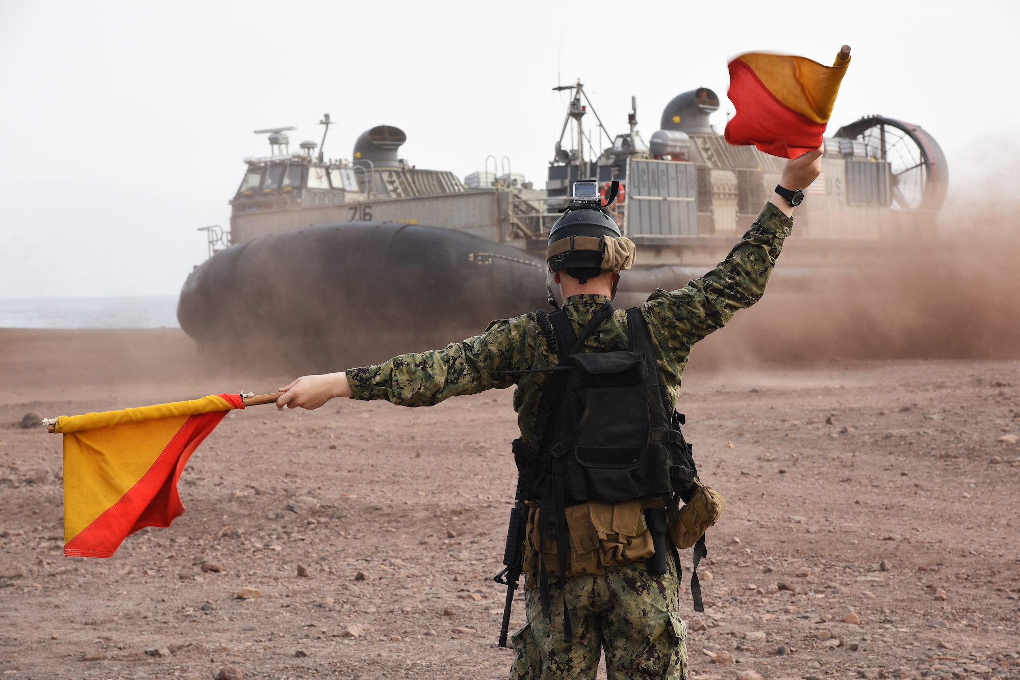 A U.S. Navy Maritime Expeditionary Security Force member signals that it is safe for a U.S. Navy Landing Craft Air Cushion (LCAC) to leave the beach and travel back to the San Antonio-class amphibious transport dock ship USS Anchorage (LPD-23) in Arta, Djibouti, July 20, 2015. LCACs for this military ship delivered U.S. Marines and equipment from the 15th Marine Expeditionary Unit for sustainment training. (U.S. Air Force photo by Staff Sgt. Maria Bowman)