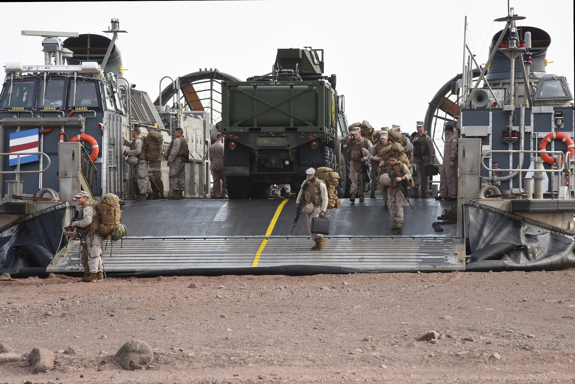 U.S. Marines from the 15th Marine Expeditionary Unit disembark from a U.S. Navy Landing Craft Air Cushion (LCAC) in Arta, Djibouti, July 20, 2015. The Marines came from USS Anchorage for two weeks of training. (U.S. Air Force photo by Staff Sgt. Maria Bowman)