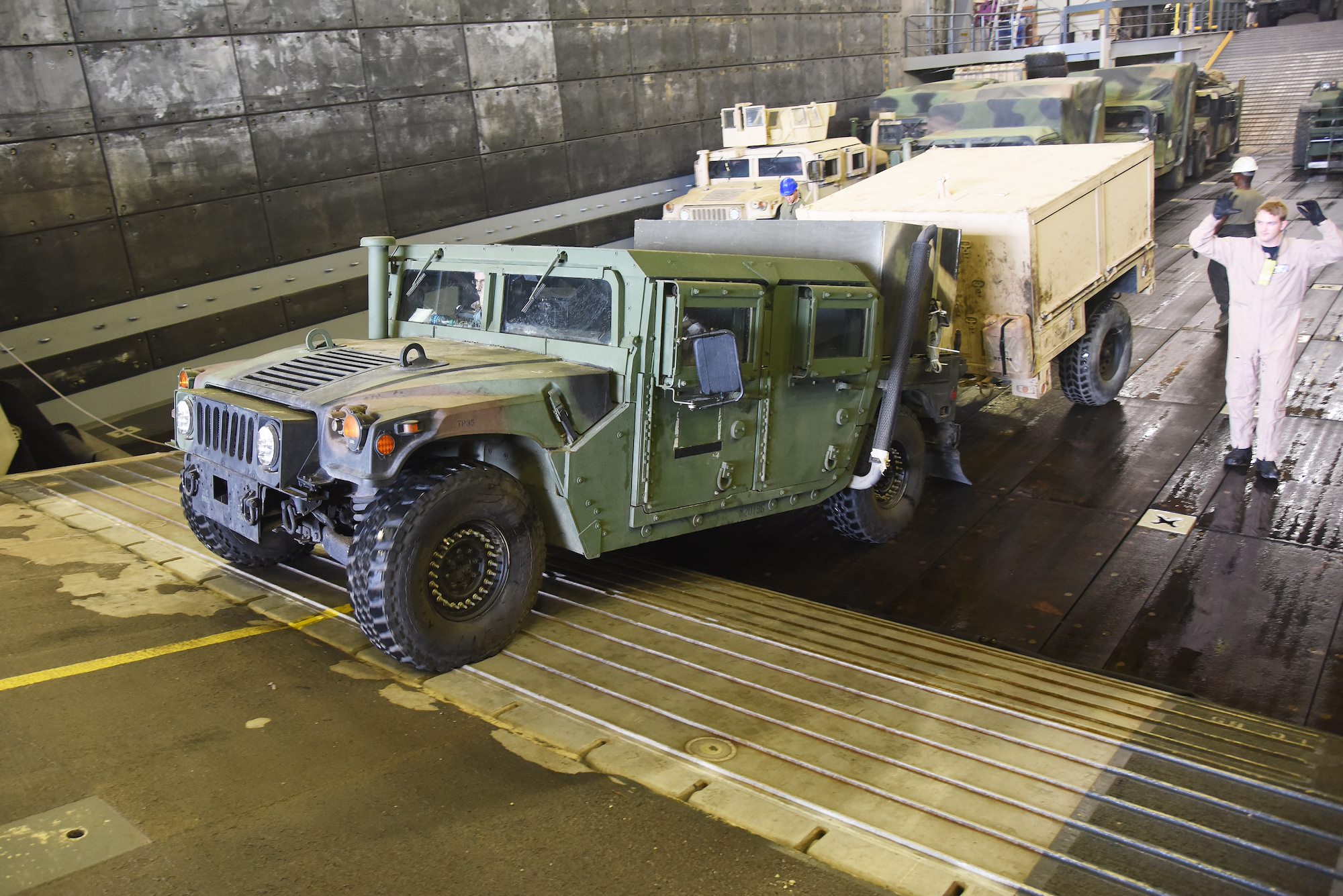 A U.S. Marine HMMWV loads onto a U.S. Navy Landing Craft Air Cushion (LCAC) in Arta, Djibouti, July 20, 2015. Marine HMMWVs serve as command and control, troop transport, shelter carrier, towed weapons mover, and can be used as an ambulance. (U.S. Air Force photo by Staff Sgt. Maria Bowman)