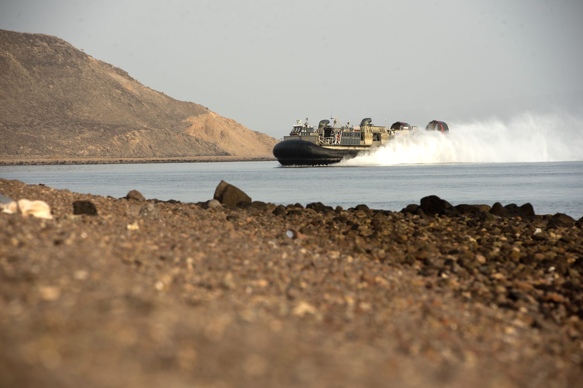 A U.S. Navy Landing Craft Air Cushion (LCAC) approaches a landing zone at Arta Beach, Djibouti, July 20, 2015. The LCAC is a hovercraft used by the U.S. Navy’s Assault Craft Units to transport and deliver personnel and equipment from ship to shore and across beaches and was in Djibouti as part of two week sustainment training exercise for the 15th Marine Expeditionary Unit. (U.S. Air Force photo by Staff Sgt. Nathan Maysonet)