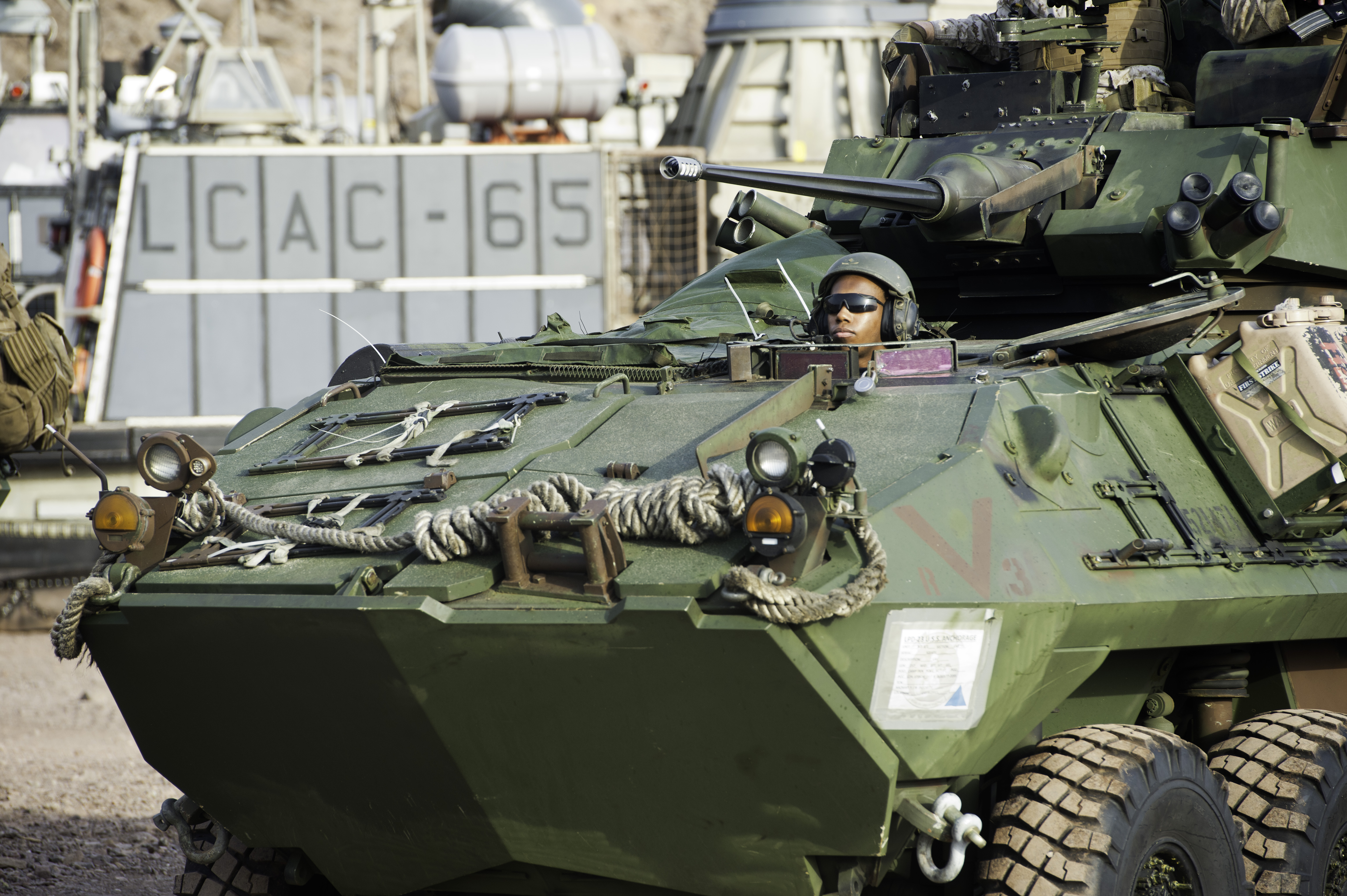 A U.S. Marine Light Armored Vehicle (LAV-25) driver assigned to the 15th Marine Expeditionary Unit, awaits orders after disembarking from a U.S. Navy Landing Craft Air Cushion (LCAC) from the San Antonio-class amphibious transport dock ship USS Anchorage (LPD-23) as part of a two week training exercise at Arta Beach, Djibouti, July 20, 2015. The LAV-25 is a Marine Corps amphibious reconnaissance vehicle used for security, command and control, reconnaissance and assault. (U.S. Air Force photo by Staff Sgt. Nathan Maysonet)
