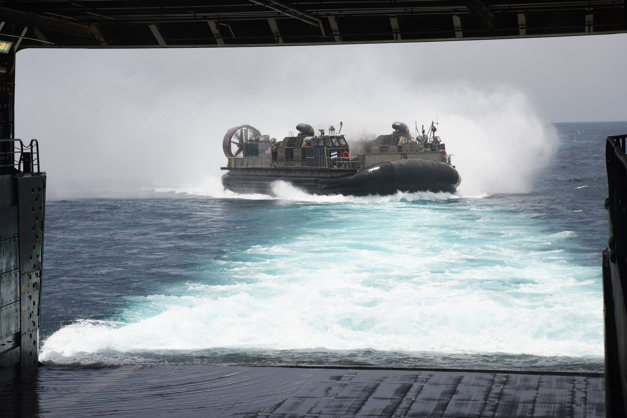 A U.S. Navy Landing Craft Air Cushion (LCAC) approaches USS Anchorage in Arta, Djibouti, July 20, 2015. USS Anchorage is a transport dock ship, and is designed to transport and land elements of a landing force for expeditionary warfare missions. (U.S. Air Force photo by Staff Sgt. Maria Bowman)