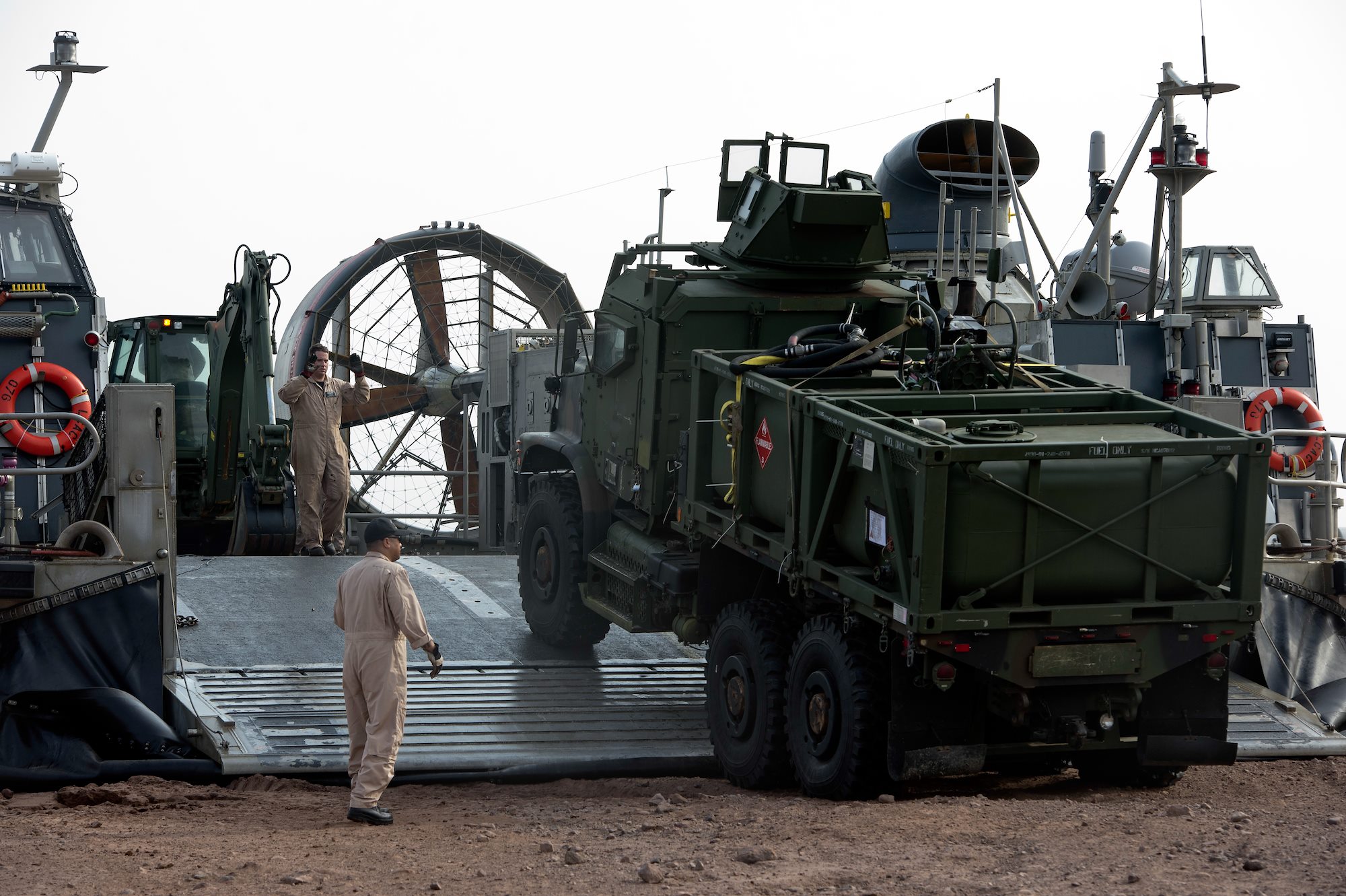 Crewmembers onboard a U.S. Navy Landing Craft Air Cushion (LCAC) help offload a fuel truck at Arta Beach, Djibouti, July 20, 2015. LCACs from the San Antonio-class amphibious transport dock ship USS Anchorage (LPD-23) helped deliver U.S. Marines and equipment from the 15th Marine Expeditionary Unit for sustainment training at the Djiboutian Armed Forces training range. (U.S. Air Force photo by Staff Sgt. Nathan Maysonet)