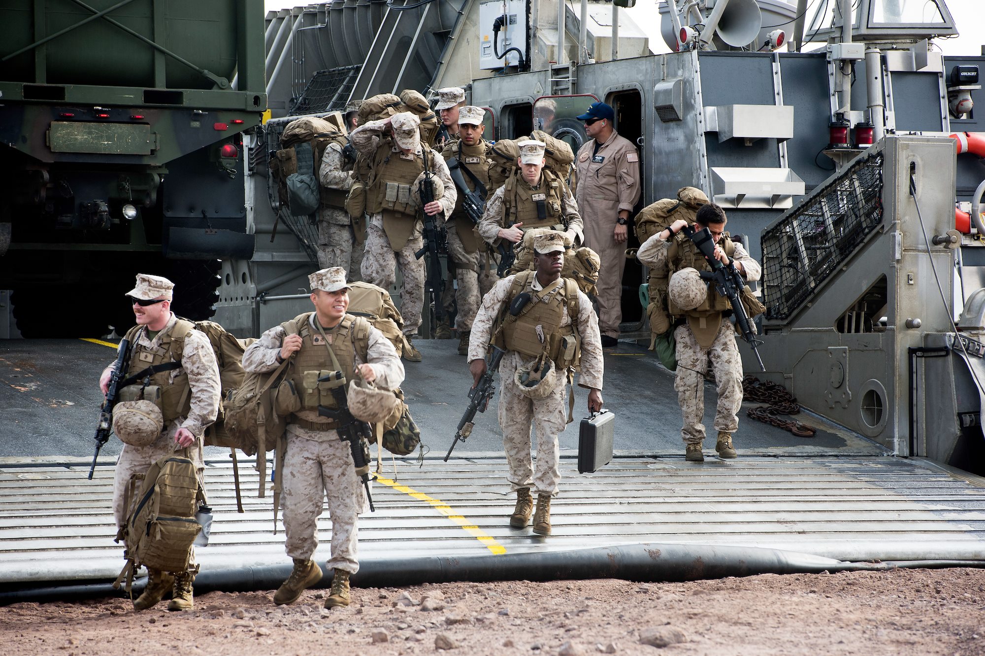 U.S. Marines from the 15th Marine Expeditionary Unit step off a U.S. Navy Landing Craft Air Cushion (LCAC) at Arta Beach, Djibouti, July 20, 2015. The Marines arrived in Djibouti from the San Antonio-class amphibious transport dock ship USS Anchorage (LPD-23) for two weeks of sustainment training which included, live fire exercises, and mounted vehicle patrols. (U.S. Air Force photo by Staff Sgt. Nathan Maysonet)