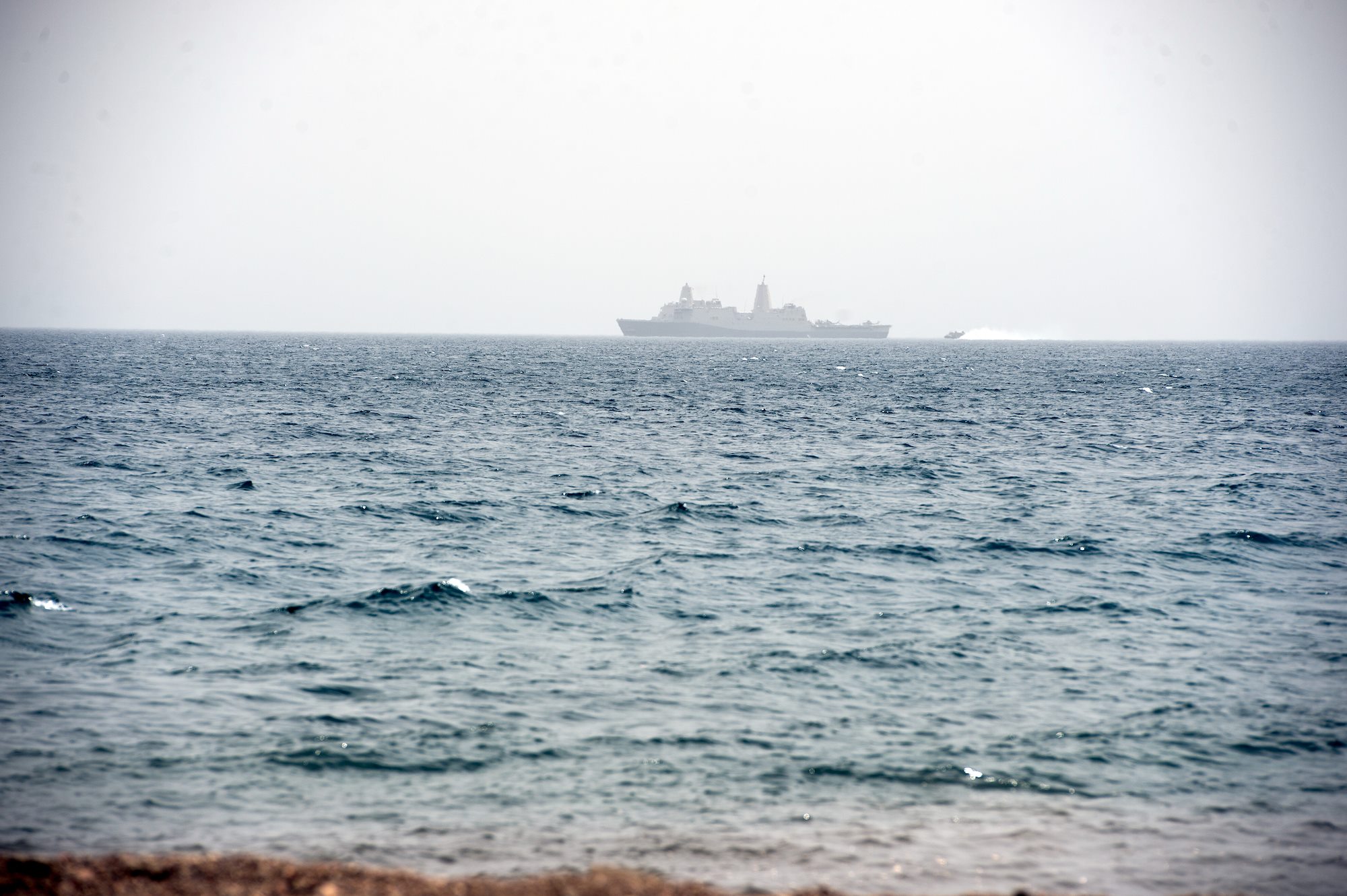 The San Antonio-class amphibious transport dock ship USS Anchorage (LPD-23) patrols the Gulf of Tadjoura as a Landing Craft Air Cushion (LCAC) approaches its stern during a two week sustainment exercise for the 15th Marine Expeditionary Unit in Djibouti, Africa, July 20, 2015. USS Anchorage, also known as an amphibious warfare ship, and is designed to transport and land elements of a landing force for expeditionary warfare missions. (U.S. Air Force photo by Staff Sgt. Nathan Maysonet)