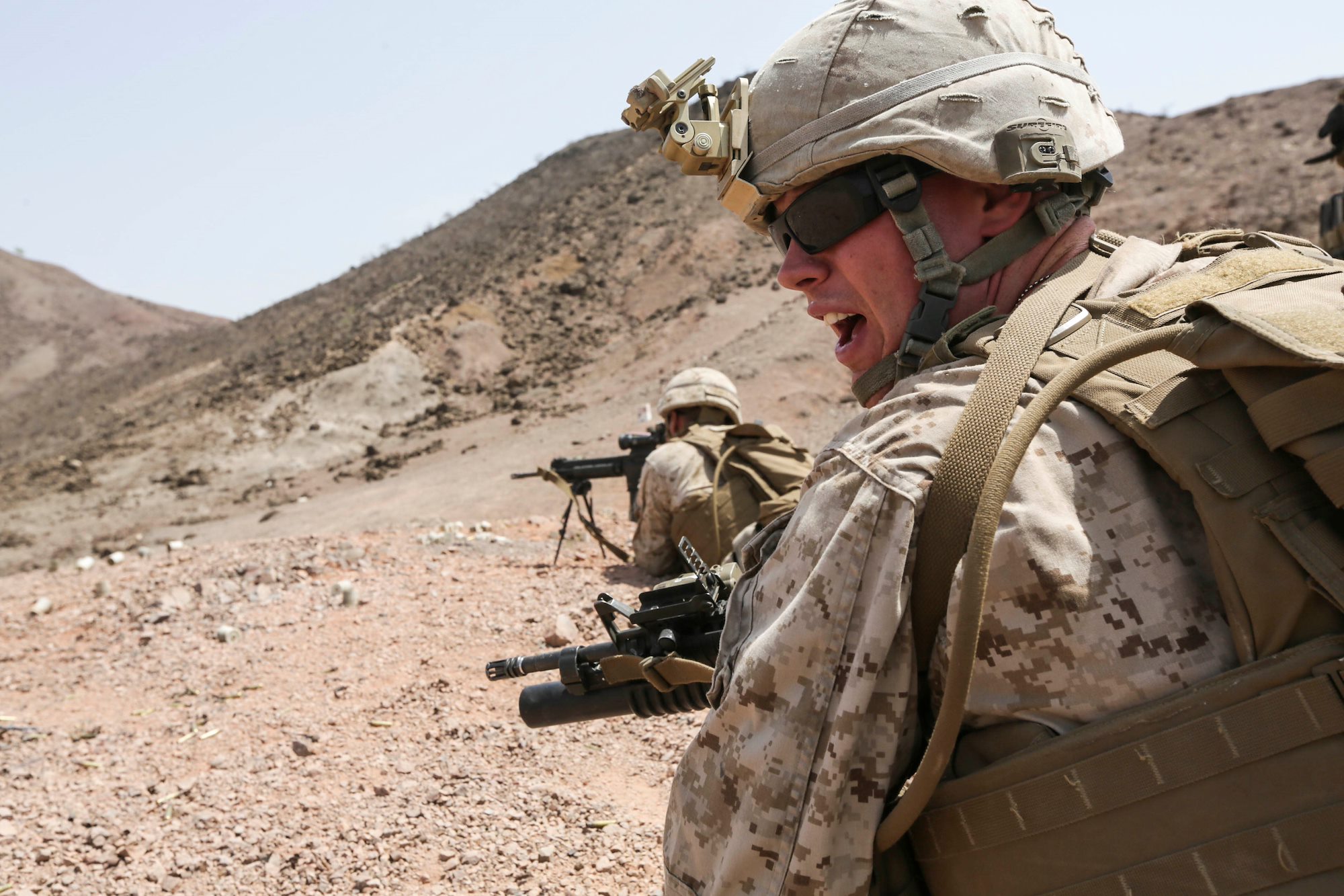 ARTA BEACH, Djibouti (July 22, 2015) A U.S. Marine team leader with Battalion Landing Team 3rd Battalion, 1st Marine Regiment, 15th Marine Expeditionary Unit, yells commands to his squad during a squad-attack exercise. The Marines of BLT 3/1 executed a series of attack and maneuver drills consisting of, machine gun, squad and night attacks. Elements of the 15th Marine Expeditionary Unit are ashore in Djibouti for sustainment training to maintain and enhance the skills they developed during their pre-deployment training period. The 15th MEU is currently deployed in support of maritime security operations and theater security cooperation efforts in the U.S. 5th and 6th Fleet areas of operation. (U.S. Marine Corps photo by Sgt. Jamean Berry/Released)