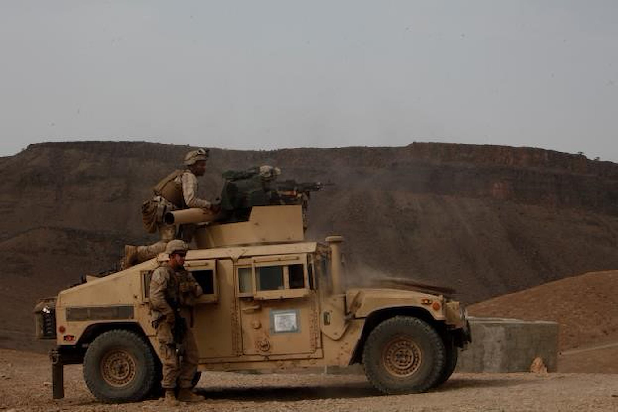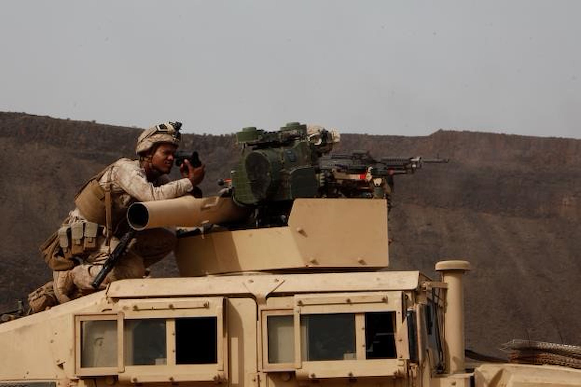 ARTA BEACH, Djibouti (July 28, 2015) U.S. Marine Cpl. Tyrone Watkins observes the impact area as Marines fire at targets simulating tanks. Watkins is a vehicle commander with Combined Anti-Armor Team 1, Weapons Company, Battalion Landing Team 3rd Battalion, 1st Marine Regiment, 15th Marine Expeditionary Unit. Elements of the 15th MEU are ashore in Djibouti for sustainment training to maintain and enhance the skills they developed during their pre-deployment training period. The 15th MEU is currently deployed in support of maritime security operations and theater security cooperation efforts in the U.S. 5th and 6th Fleet areas of operation. (U.S. Marine Corps photo by Gunnery Sgt. Eddy Arce/Released)