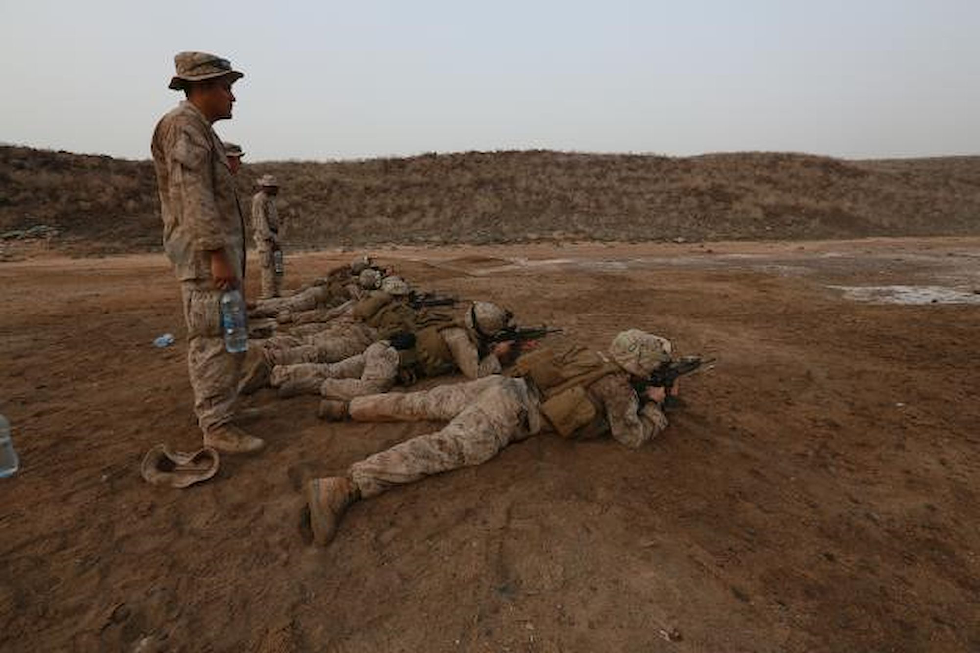 U.S. Marine Cpl. Joseph Monrreal, left, watches over Marines as they fire their weapons try establish a battle-sight zero. Monrreal was assigned as the personal safety officer during the course of fire and is a vehicle gunner with Combined Anti-Armor Team 1, Weapons Company, Battalion Landing Team 3rd Battalion, 1st Marine Regiment, 15th Marine Expeditionary Unit. Elements of the 15th MEU are ashore in Djibouti for sustainment training to maintain and enhance the skills they developed during their pre-deployment training period. The 15th MEU is currently deployed in support of maritime security operations and theater security cooperation efforts in the U.S. 5th and 6th Fleet areas of operation. (U.S. Marine Corps photo by Gunnery Sgt. Eddy Arce/Released)
