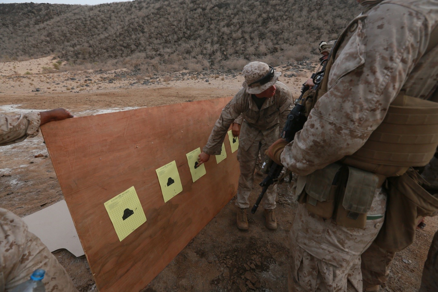 ARTA BEACH, Djibouti (July 26, 2015) U.S. Marine Lance Cpl. Jake Kelley, middle, shows Marines their shot groups while Marines establish battle-sight zeros for their weapons. Kelley is a vehicle commander with Combined Anti-Armor Team 1, Weapons Company, Battalion Landing Team 3rd Battalion, 1st Marine Regiment, 15th Marine Expeditionary Unit. Elements of the 15th MEU are ashore in Djibouti for sustainment training to maintain and enhance the skills they developed during their pre-deployment training period. The 15th MEU is currently deployed in support of maritime security operations and theater security cooperation efforts in the U.S. 5th and 6th Fleet areas of operation. (U.S. Marine Corps photo by Gunnery Sgt. Eddy Arce/Released)