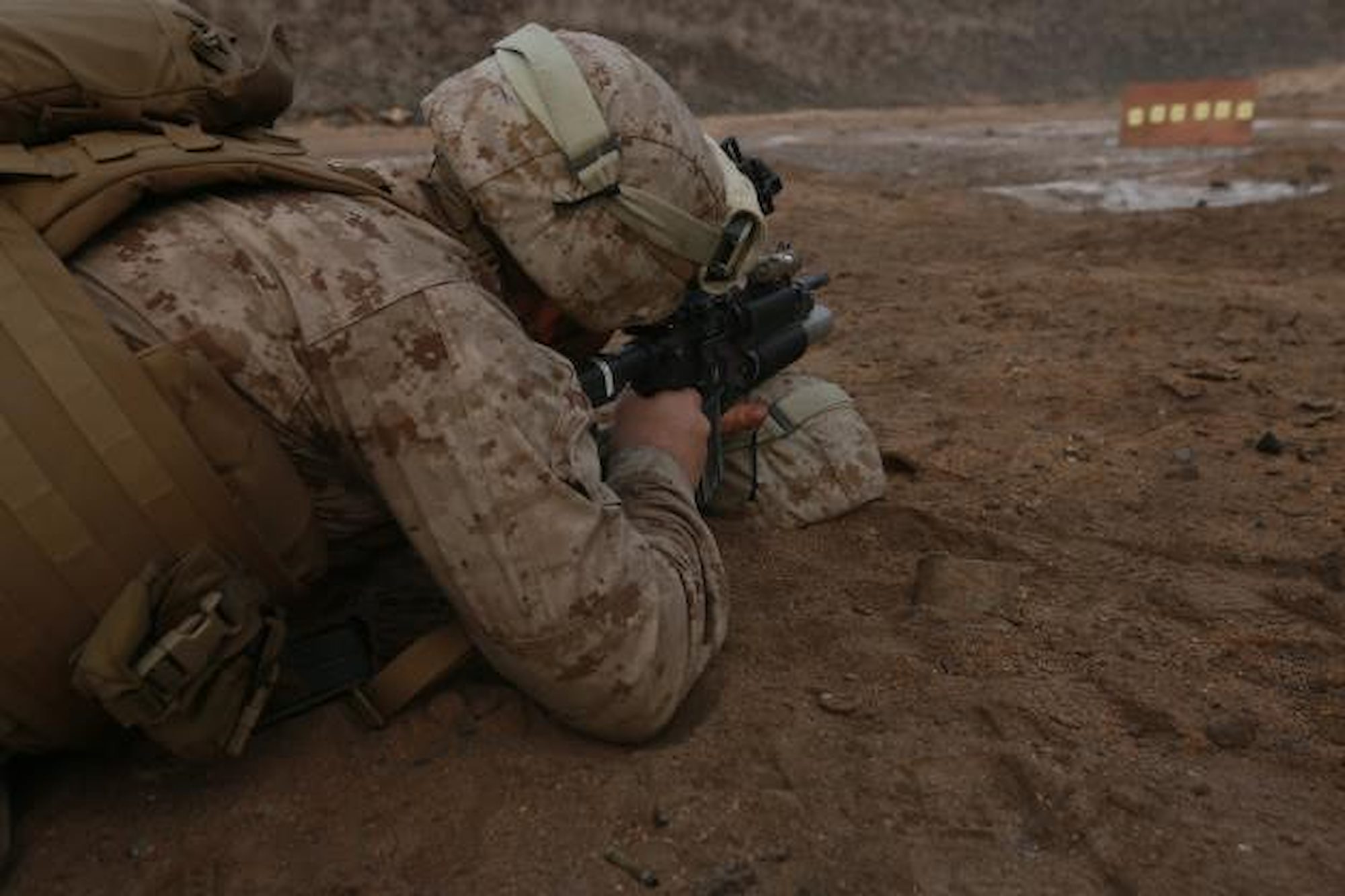 ARTA BEACH, Djibouti (July 26, 2015) U.S. Marine Cpl. Daniel Molina establishes a battle-sight zero with his M4 carbine. Molina is a vehicle commander with Combined Anti-Armor Team 1, Weapons Company, Battalion Landing Team 3rd Battalion, 1st Marine Regiment, 15th Marine Expeditionary Unit. Elements of the 15th MEU are ashore in Djibouti for sustainment training to maintain and enhance the skills they developed during their pre-deployment training period. The 15th MEU is currently deployed in support of maritime security operations and theater security cooperation efforts in the U.S. 5th and 6th Fleet areas of operation. (U.S. Marine Corps photo by Gunnery Sgt. Eddy Arce/Released)