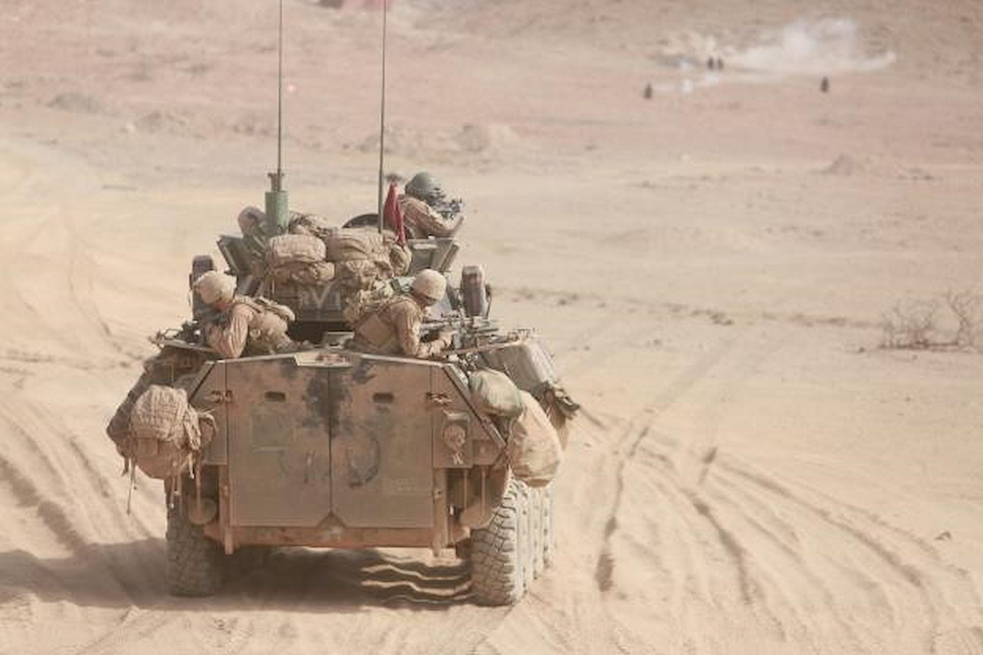 ARTA BEACH, Djibouti (July 29, 2015) U.S. Marines with Light Armored Reconnaissance Detachment, Battalion Landing Team 3rd Battalion, 1st Marine Regiment, 15th Marine Expeditionary Unit, practice fire and maneuver in Light Armored Vehicles (LAV-25) during sustainment training. Elements of the 15th MEU are ashore in Djibouti for sustainment training to maintain and enhance the skills they developed during their pre-deployment training period. The 15th MEU is currently deployed in support of maritime security operations and theater security cooperation efforts in the U.S. 5th and 6th Fleet areas of operation. (U.S. Marine Corps photo by Sgt. Steve H. Lopez/Released)