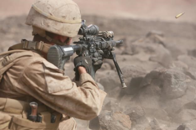 ARTA BEACH, Djibouti (July 29, 2015) A U.S. Marine with Light Armored Reconnaissance Detachment, Battalion Landing Team 3rd Battalion, 1st Marine Regiment, 15th Marine Expeditionary Unit, engages his target in a fire-and-maneuver exercise during sustainment training. Elements of the 15th MEU are ashore in Djibouti for sustainment training to maintain and enhance the skills they developed during their pre-deployment training period. The 15th MEU is currently deployed in support of maritime security operations and theater security cooperation efforts in the U.S. 5th and 6th Fleet areas of operation. (U.S. Marine Corps photo by Sgt. Steve H. Lopez/Released)