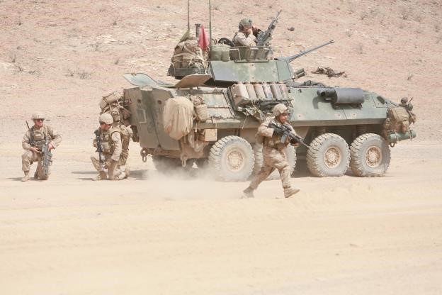 ARTA BEACH, Djibouti (July 29, 2015) U.S. Marines with Light Armored Reconnaissance Detachment, Battalion Landing Team 3rd Battalion, 1st Marine Regiment, 15th Marine Expeditionary Unit, dismount a Light Armored Vehicle (LAV-25) and take their fighting positions during sustainment training. Elements of the 15th MEU are ashore in Djibouti for sustainment training to maintain and enhance the skills they developed during their pre-deployment training period. The 15th MEU is currently deployed in support of maritime security operations and theater security cooperation efforts in the U.S. 5th and 6th Fleet areas of operation. (U.S. Marine Corps photo by Sgt. Steve H. Lopez/Released)