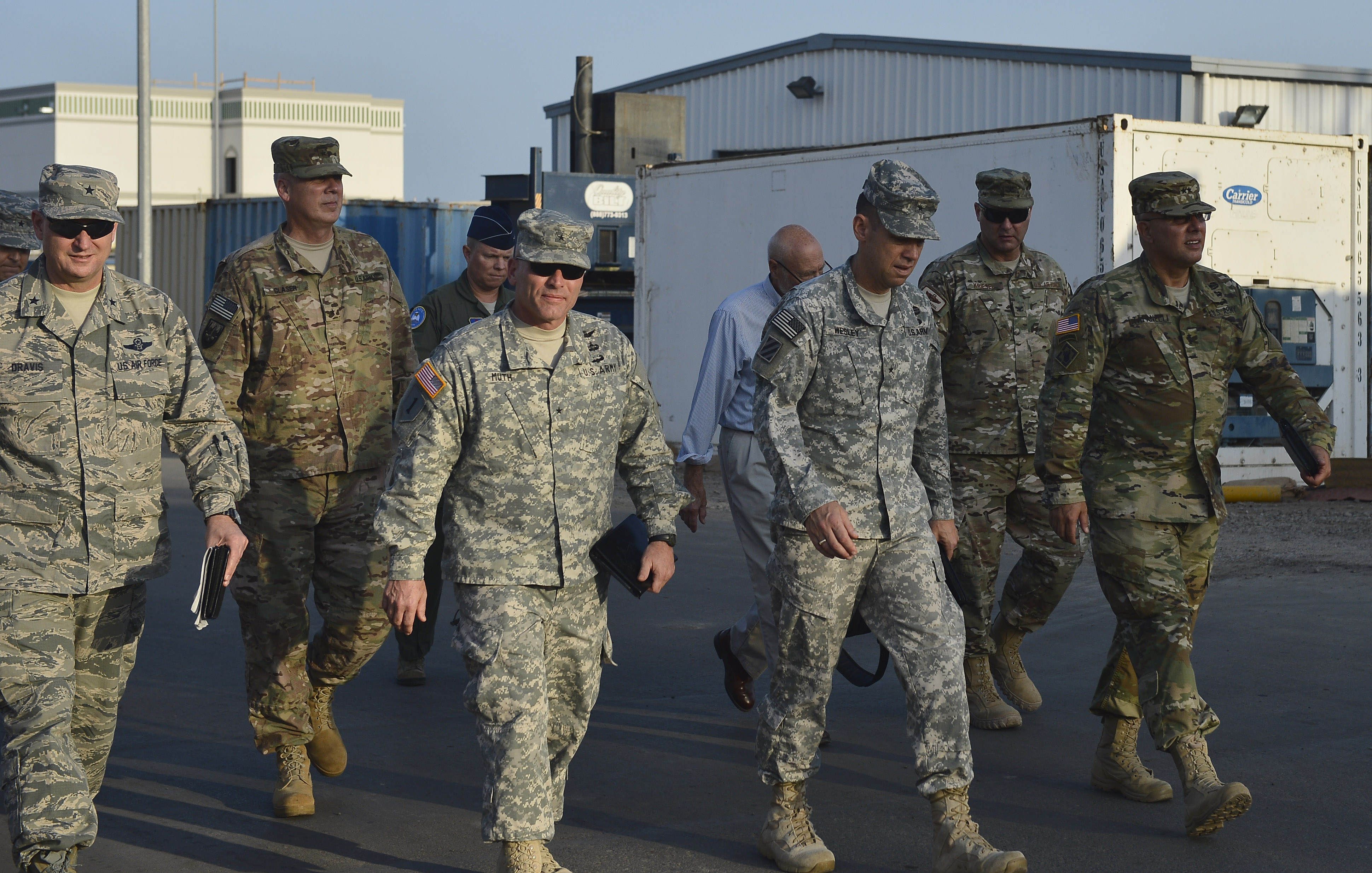 Fellows from the 2016-1 CAPSTONE course tour Camp Lemonnier, Djibouti, Oct. 14, 2015. The CAPSTONE course provided newly appointed general and flag officers an opportunity to view the joint, inter-agency and multinational partnerships that enable Combined Task Force-Horn of Africa to support national security objectives. (U.S. Air Force photo by SrA Nesha Humes)