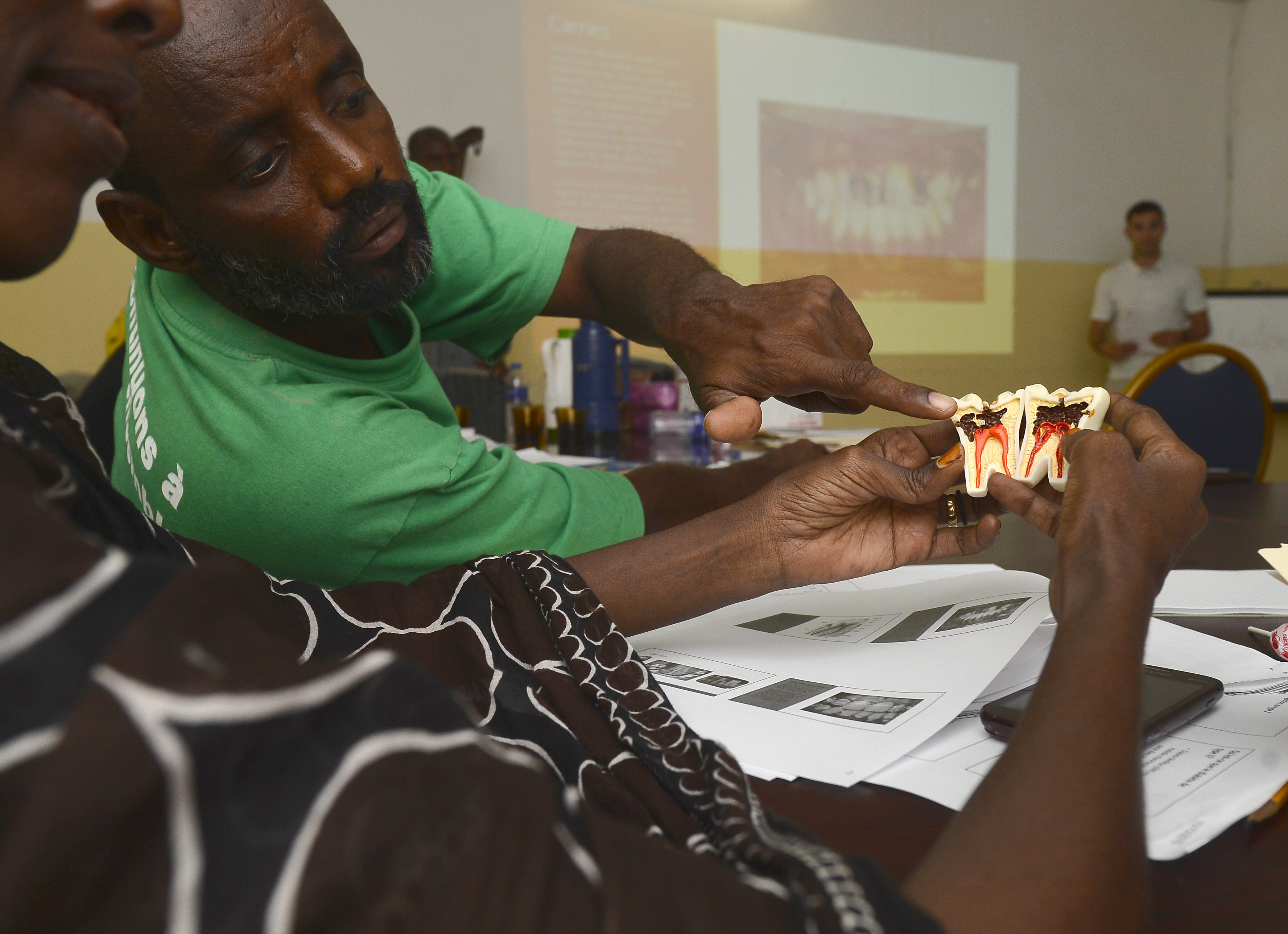Obock Regional Hospital health workers examine a tooth model during a Community Health Worker course in Obock, Djibouti, Oct. 18, 2015. U.S. Army Civil Affairs Battalion soldiers, assigned to Combined Joint Task Force-Horn of Africa, hosted the two-day course. (U.S. Air Force photo by Senior Airman Nesha Humes)