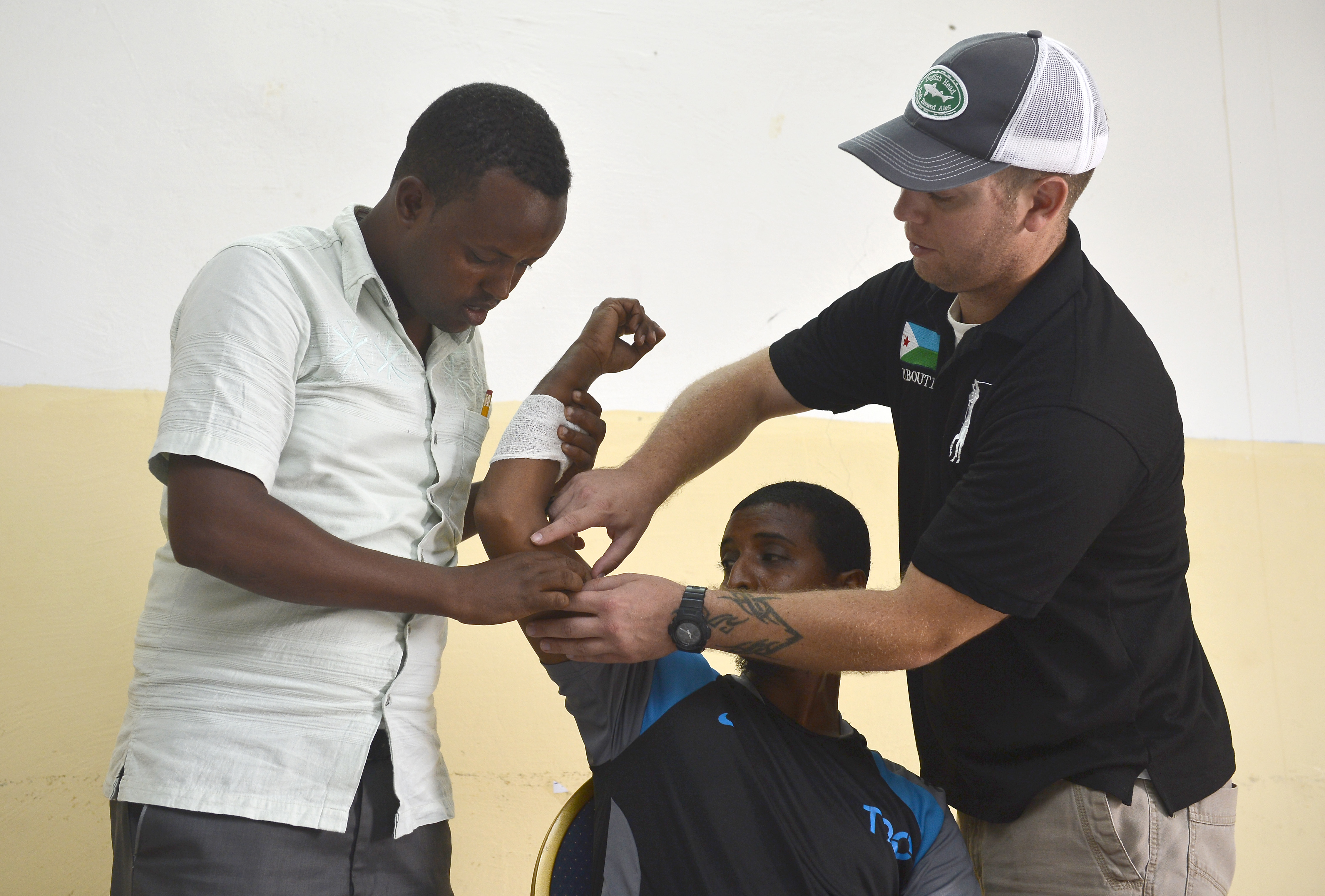 U.S. Army Staff Sgt. Joshua Domalski, Civil Affairs Battalion specialist and medic, right, demonstrates first aid procedures for community health workers in Obock, Djibouti, Oct. 17, 2015. The U.S. Army Civil Affairs Bn, assigned to Combined Joint Task Force-Horn of Africa, held a community health worker course, during which instructors taught basic preventative medicine measures, first aid, oral hygiene care, and the health hazards of female genital mutilation. (U.S. Air Force photo by Senior Airman Nesha Humes)