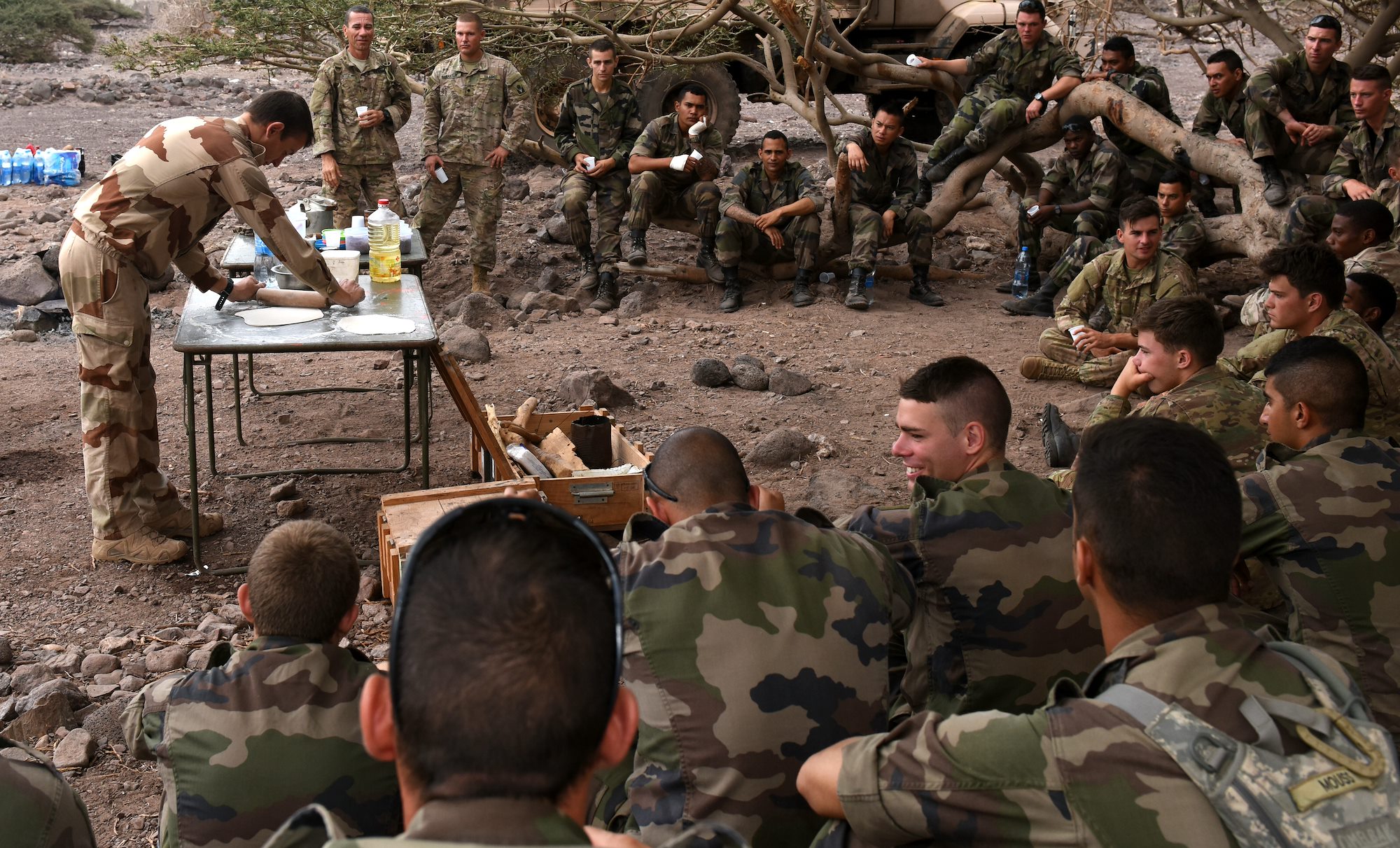 U.S. and French soldiers make flatbread during a French Desert Survival Course near Arta Beach, Djibouti, Jan. 13, 2016. Using techniques that can be used in survival situations, students worked together to make a meal for the whole group. (U.S. Air Force photo by Staff Sgt. Kate Thornton)