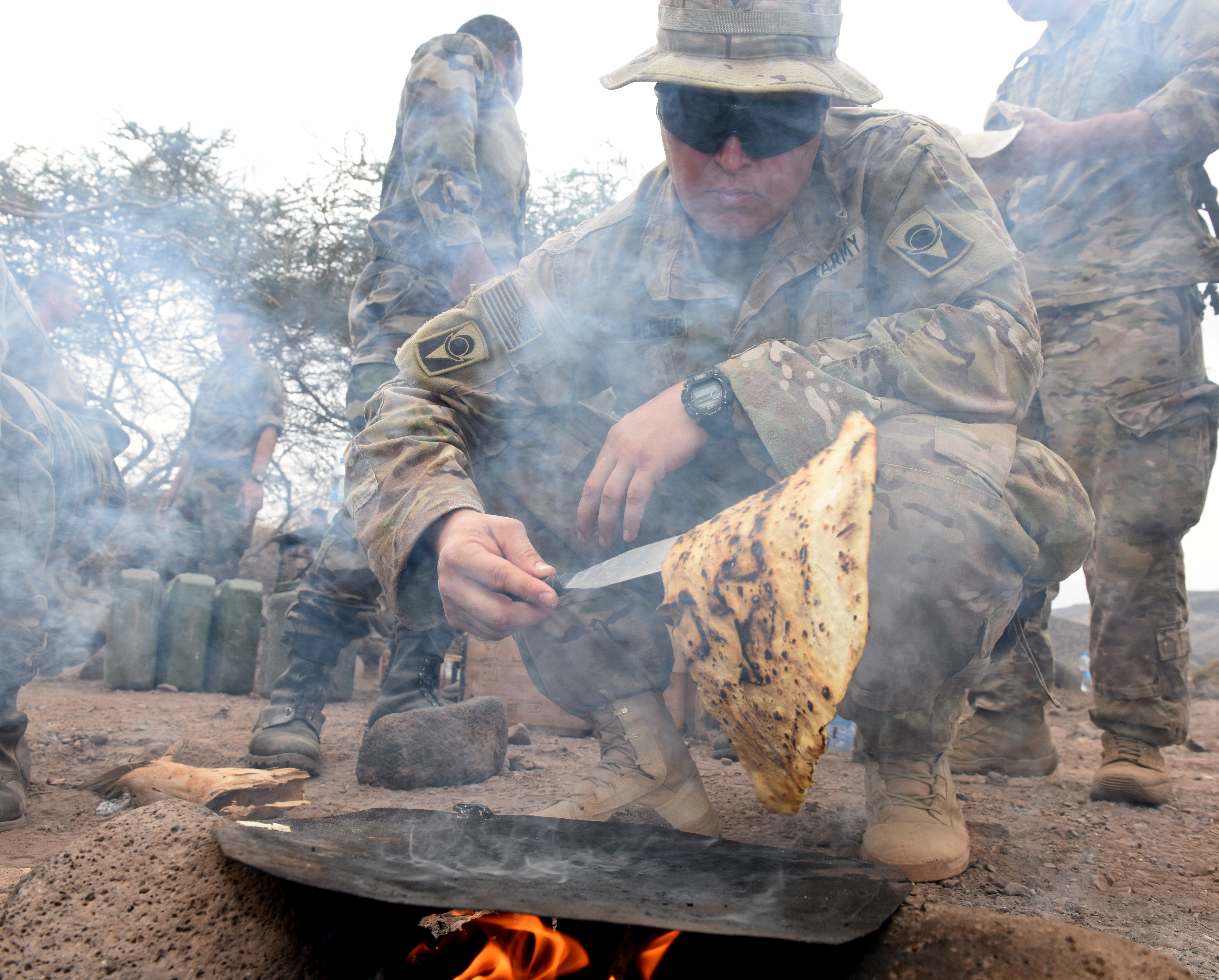 U.S. Army Spc. Christopher Reeves, 2-124 Infantry Battalion mechanic, grills flatbread during a French Desert Survival Course near Arta Beach, Djibouti, Jan. 13, 2016. Using techniques that can be used in survival situations, students worked together to make a meal for the whole group. (U.S. Air Force photo by Staff Sgt. Kate Thornton)