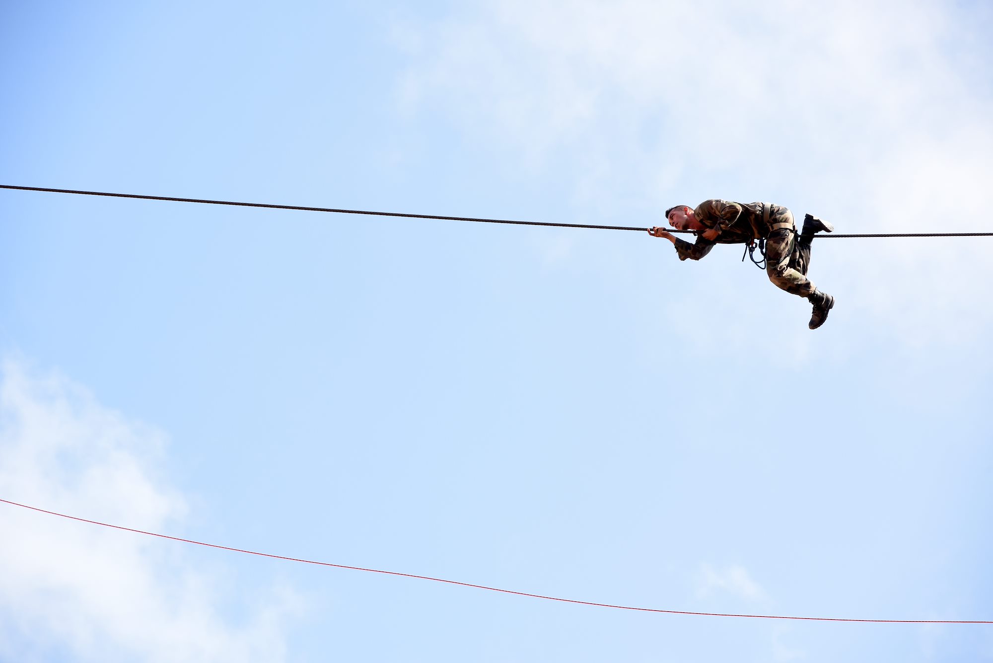 A French soldier makes his way across a single cable during a French Desert Survival Course near Arta Beach, Djibouti, Jan. 13, 2016. U.S. and French soldiers learned to fight, survive and navigate Djibouti’s desert during the course. (U.S. Air Force photo by Staff Sgt. Kate Thornton)