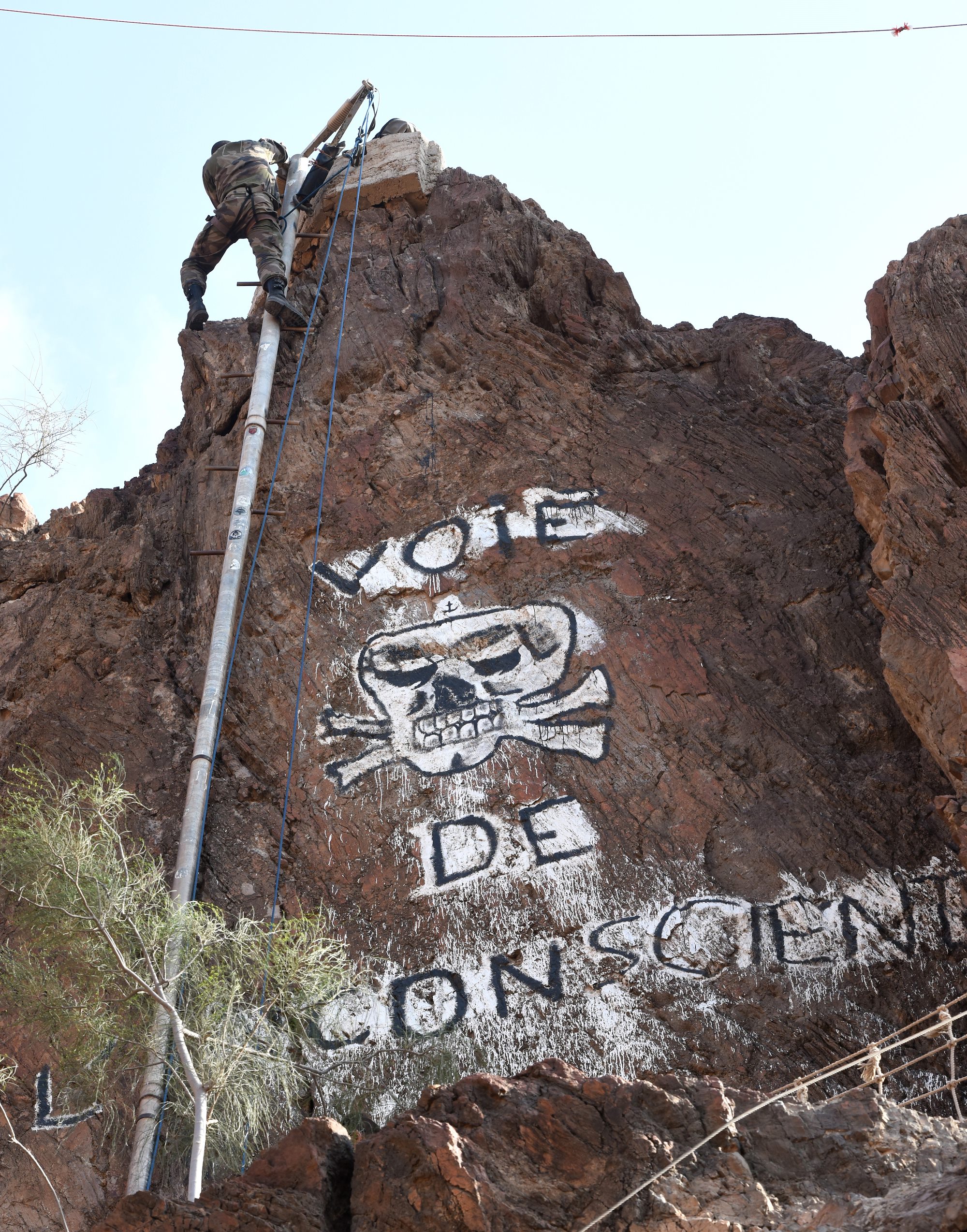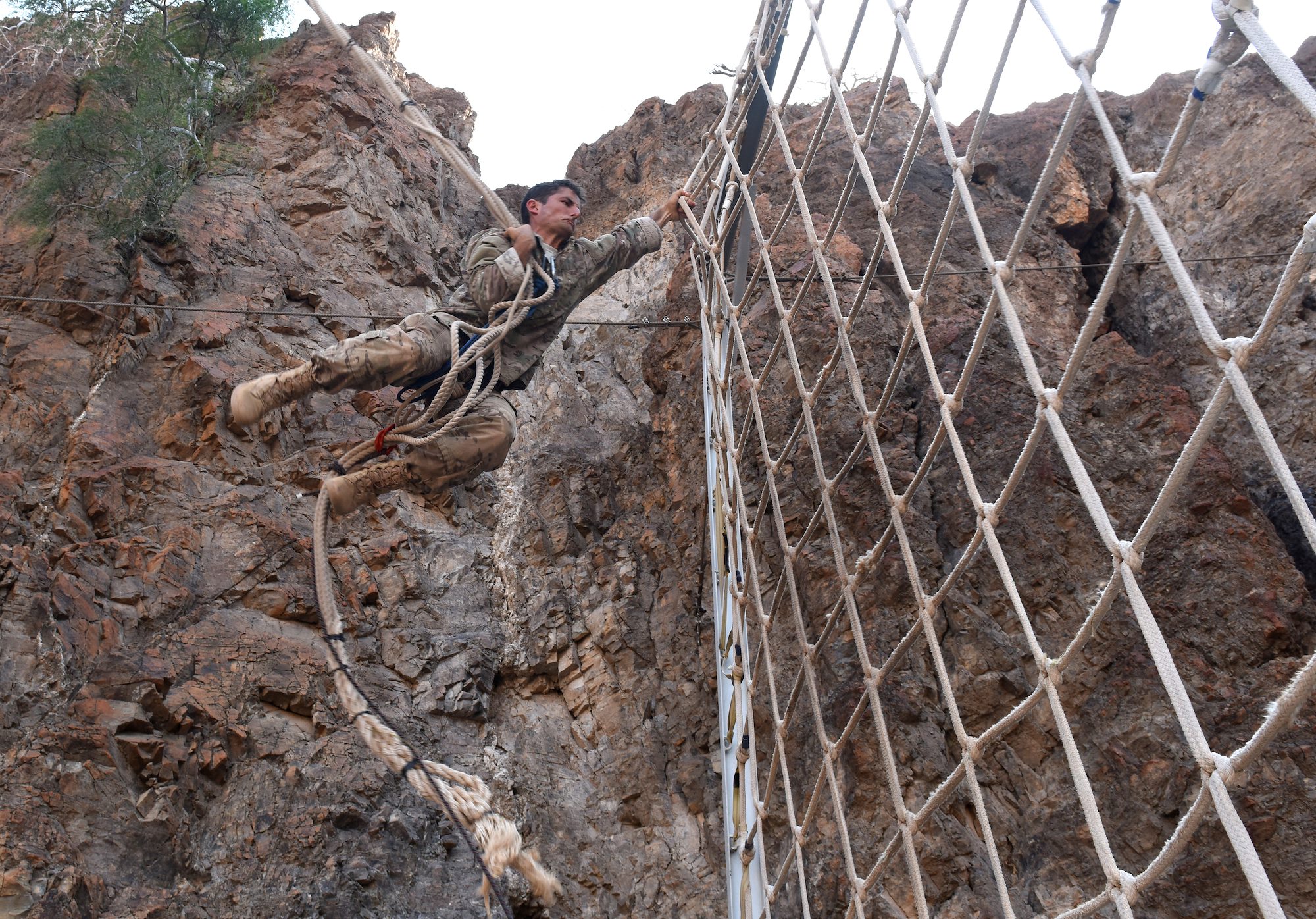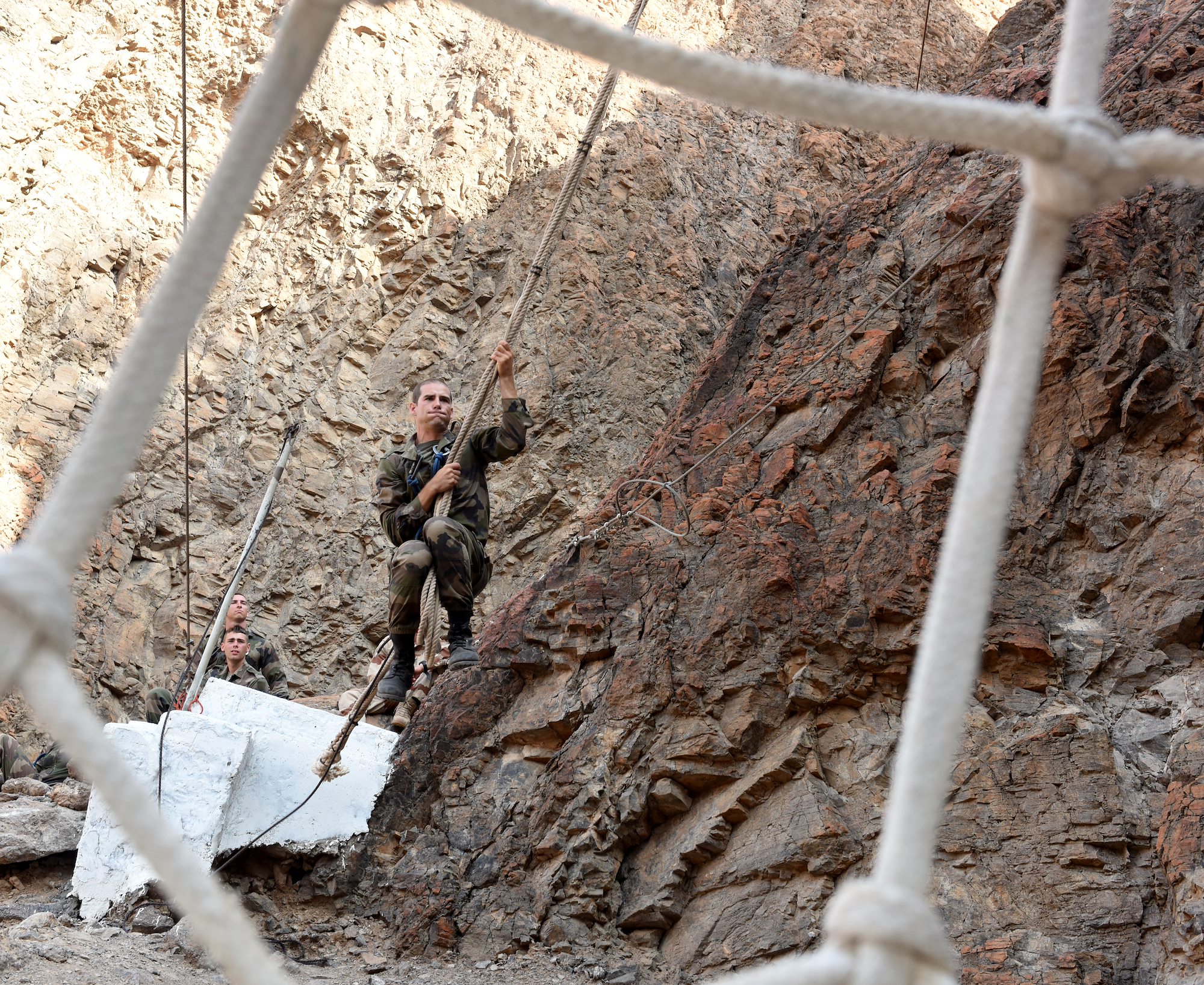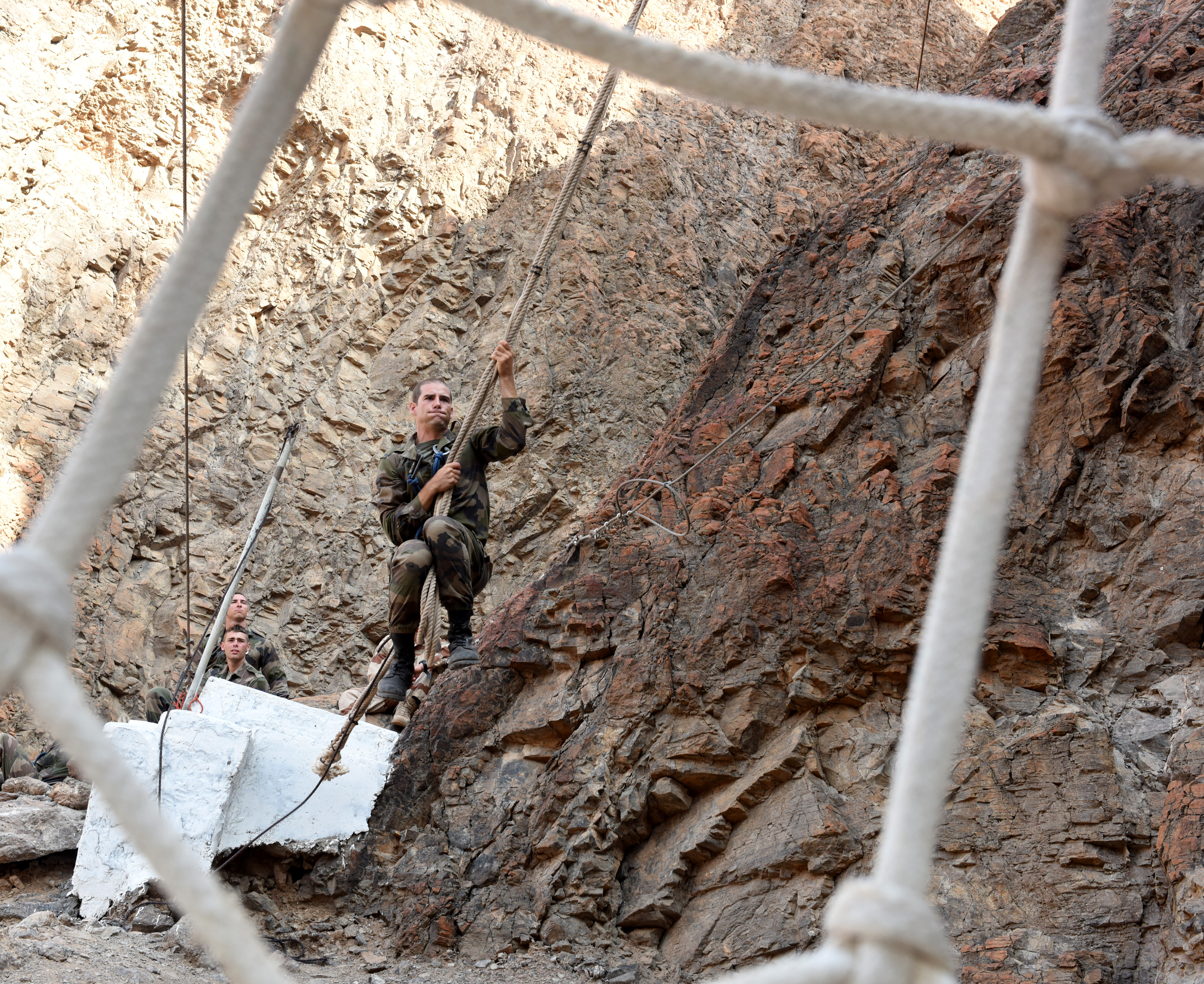 A French soldier climbs a pole during a French Desert Survival Course near Arta Beach, Djibouti, Jan. 13, 2016. The mountain portion of the course, named the “Path of the Unconscious,” consists of ropes, nets, poles, 3-wire, single-wire and flat-surface obstacles carved out of a cliff approximately 300 feet high. (U.S. Air Force photo by Staff Sgt. Kate Thornton)