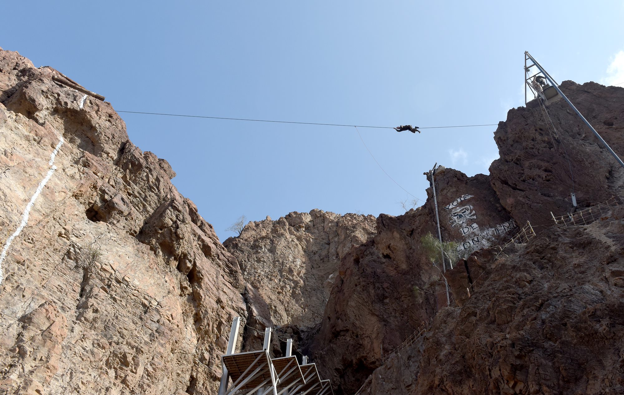 A French soldier attaches himself to a safety cable during a French Desert Survival Course near Arta Beach, Djibouti, Jan. 13, 2016. The course prepares soldiers to survive in a desert climate by teaching participants combat lifesaving skills, field tactics, land navigation, weapons training, trap setting, survival cooking and water-source locating. (U.S. Air Force photo by Staff Sgt. Kate Thornton)