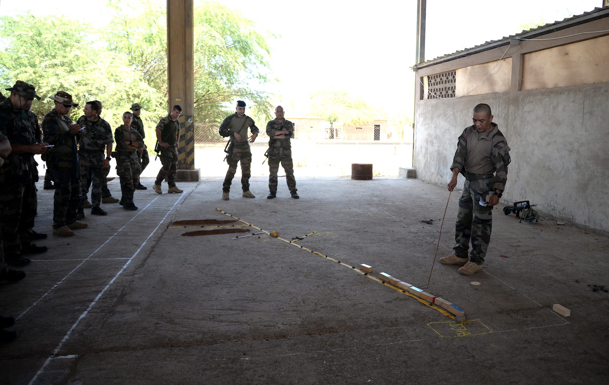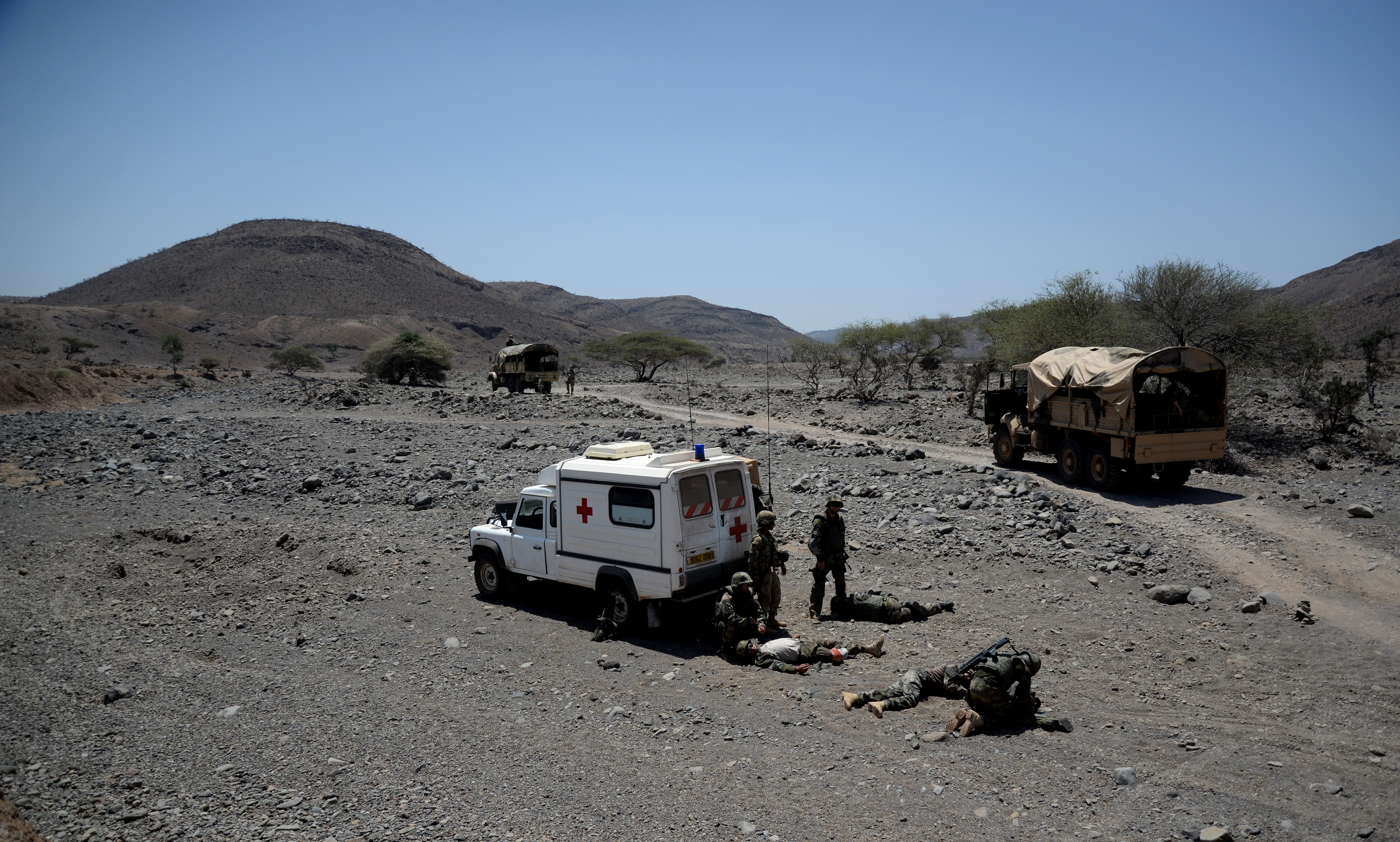 French and U.S. Army Soldiers respond to a simulated improvised explosive device attack March 17, 2016, during a field training exercise in Arta, Djibouti. The exercise, hosted by the French 5th Marine Regiment, tested and trained the Soldiers on force protection, convoy operations and counter improvised explosive device tactics. (U.S. Air Force photo by Staff Sgt. Kate Thornton)