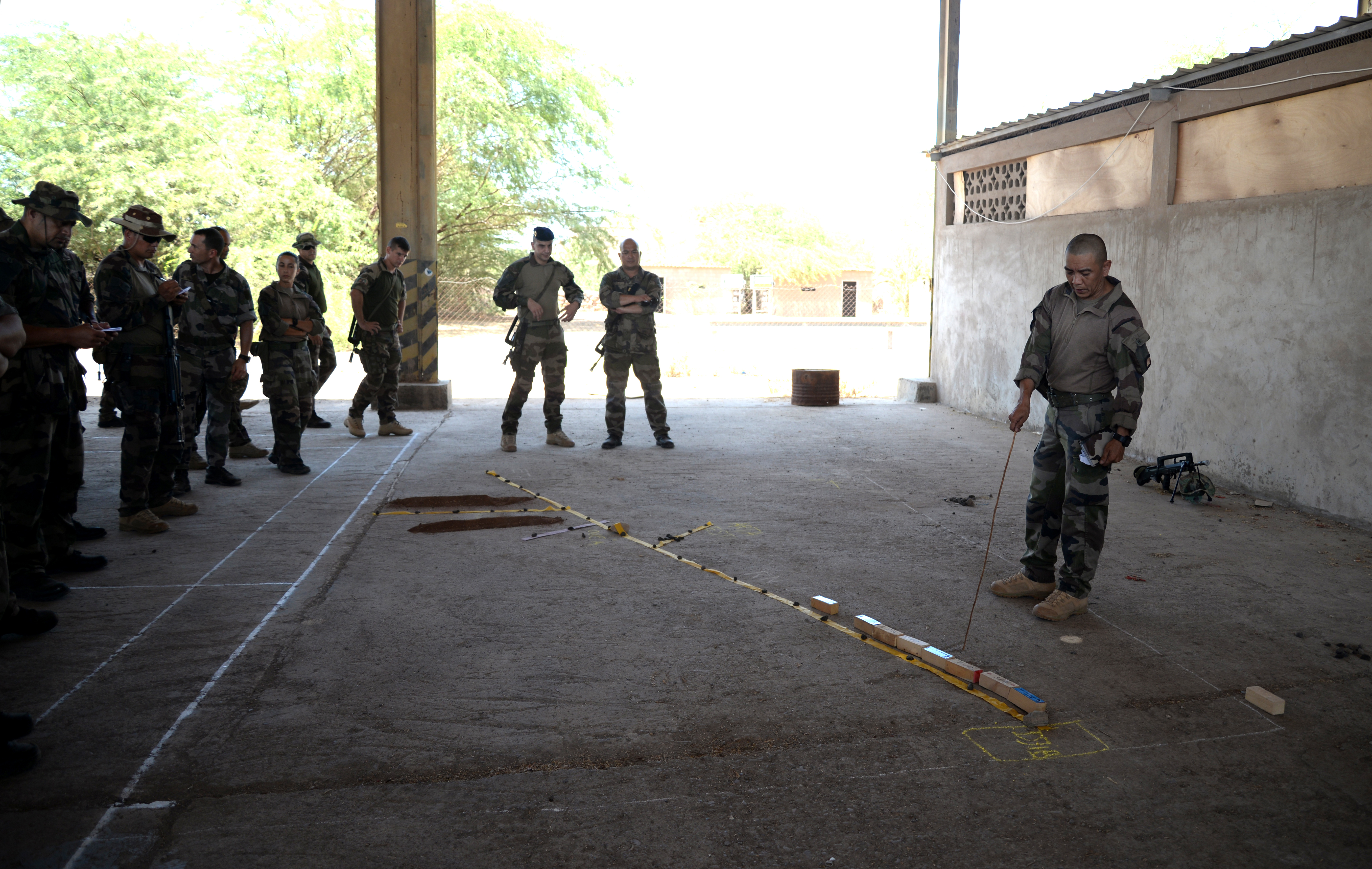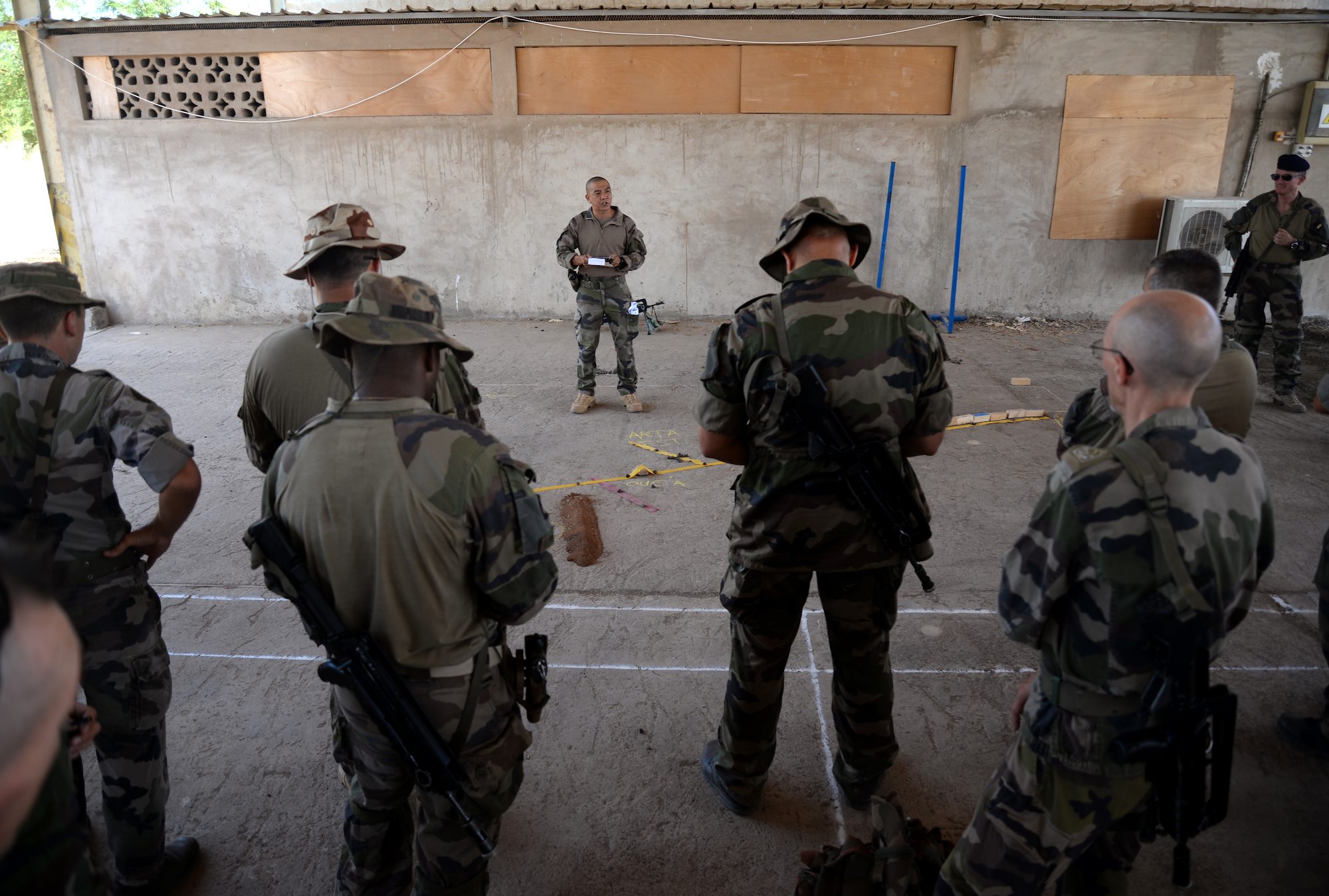 French and U.S. Army Soldiers attend a brief prior to a field training exercise March 16, 2016, at Monclair French base, Djibouti. The bilateral training exercise was one of many engagements U.S. and French forces have held throughout the year that maximizes the benefits of serving at the same location and enables the allies to learn and experience each other’s tactics, techniques and procedures. (U.S. Air Force photo by Staff Sgt. Kate Thornton)