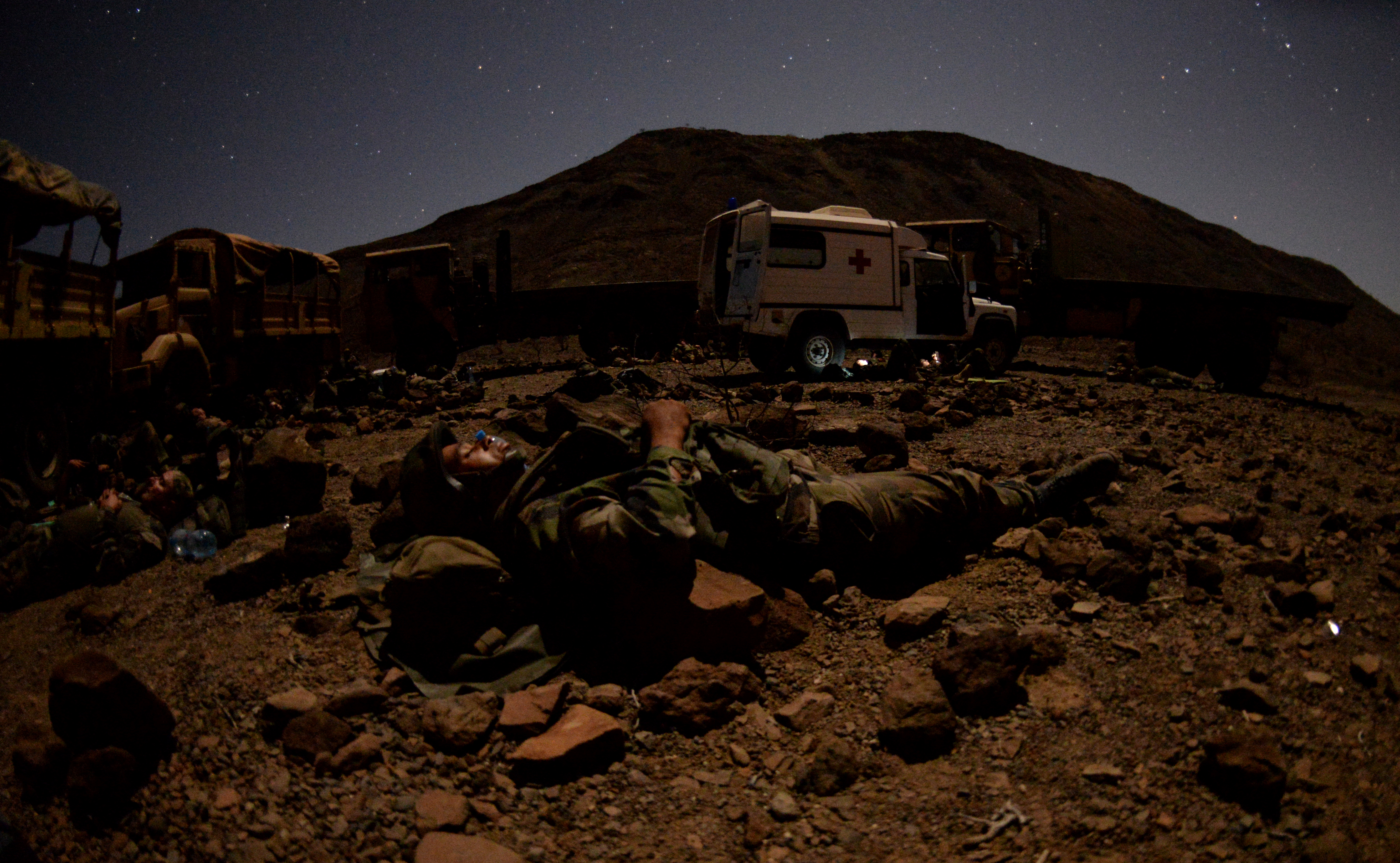 French and U.S. Army Soldiers bed down during a field training exercise March 16, 2016, in Arta, Djibouti. Soldiers got as much sleep as they could between attacks from simulated opposing forces. (U.S. Air Force photo by Staff Sgt. Kate Thornton)