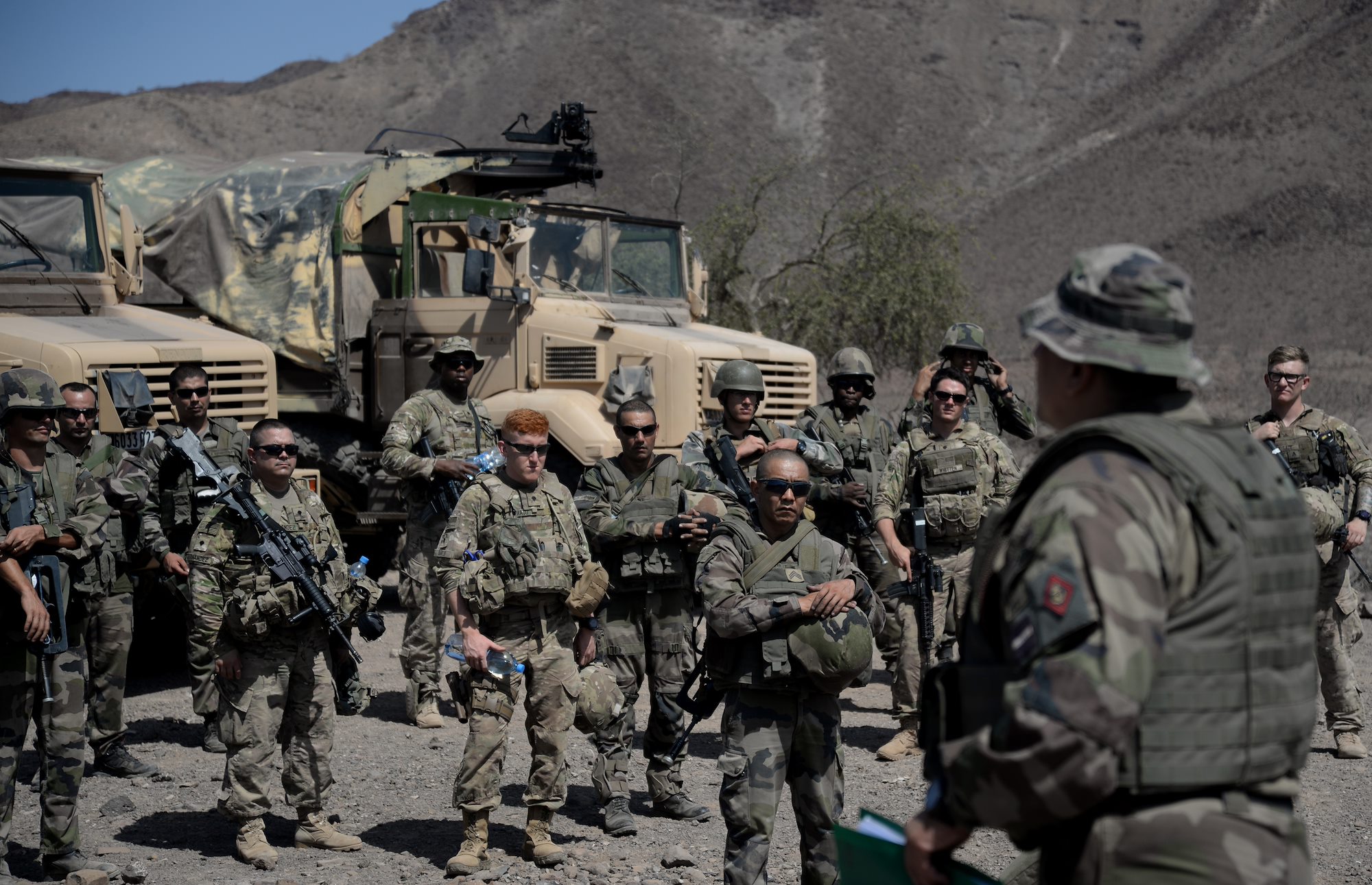 French and U.S. Army Soldiers listen to the plan of action during a field training exercise March 17, 2016, in Arta, Djibouti. The bilateral training exercise was one of many engagements U.S. and French forces have held throughout the year that maximizes the benefits of serving at the same location, and enables the allies to learn and experience each other’s tactics, techniques and procedures. (U.S. Air Force photo by Staff Sgt. Kate Thornton)