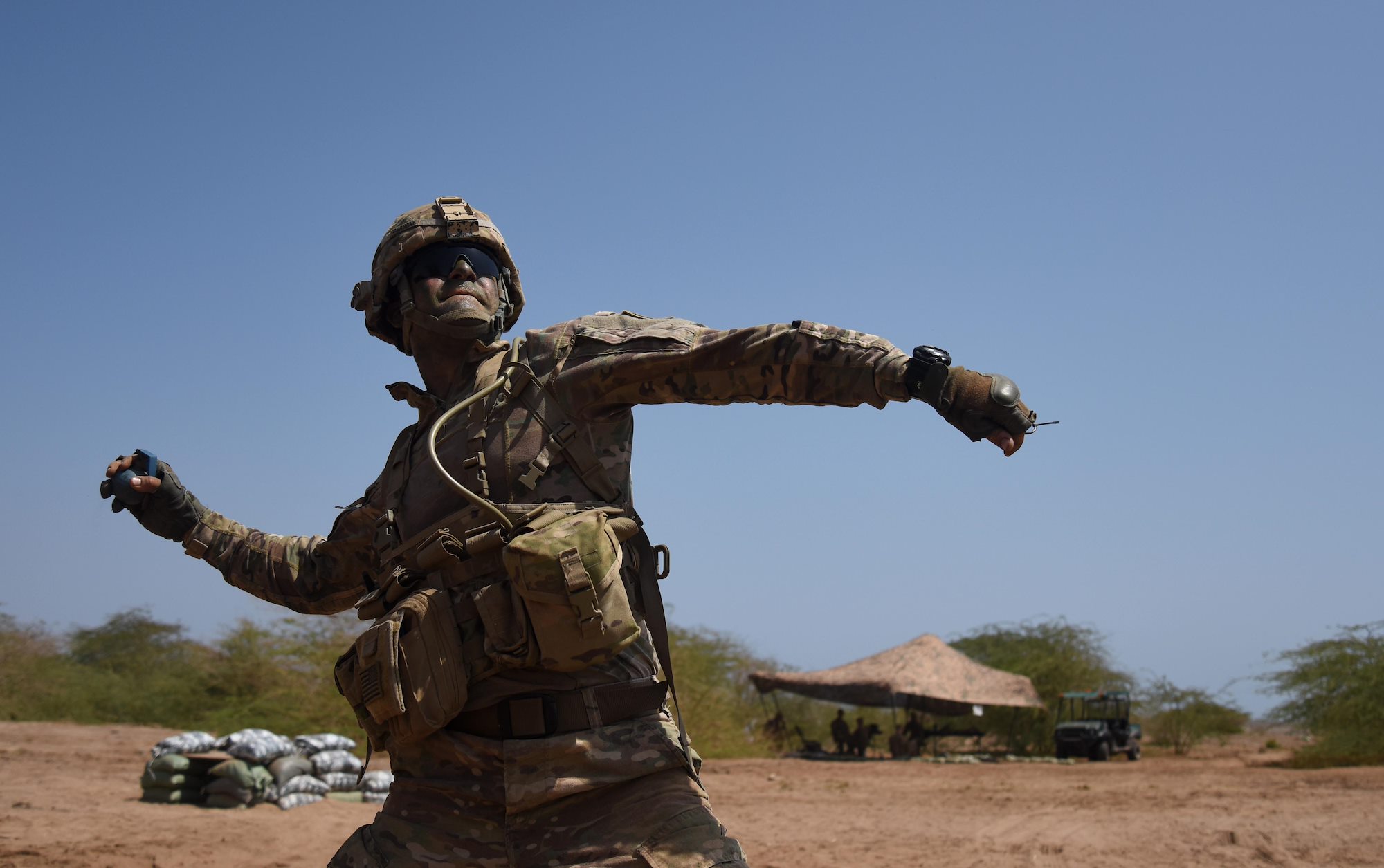 U.S. Army Expert Infantry Badge candidate throws a practice grenade March 31, 2016, during the patrolling portion of the EIB course at Camp Lemonnier, Djibouti. After completing the grenade test, candidates had to complete two different grenade application tests where they threw them 35 feet and into a simulated enemy bunker. (U.S. Air Force photo by Staff Sgt. Kate Thornton)