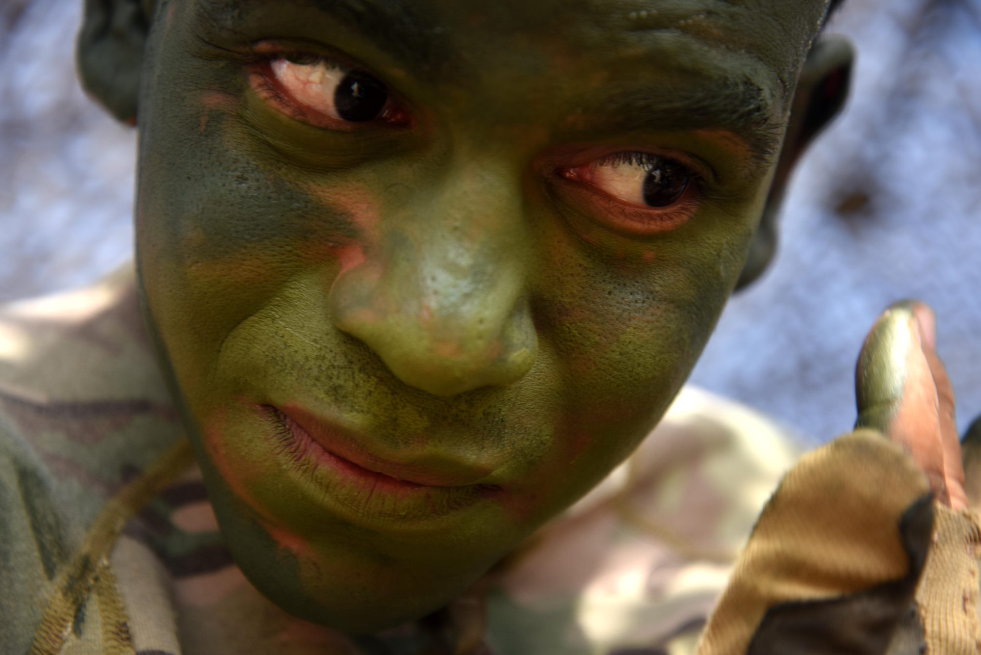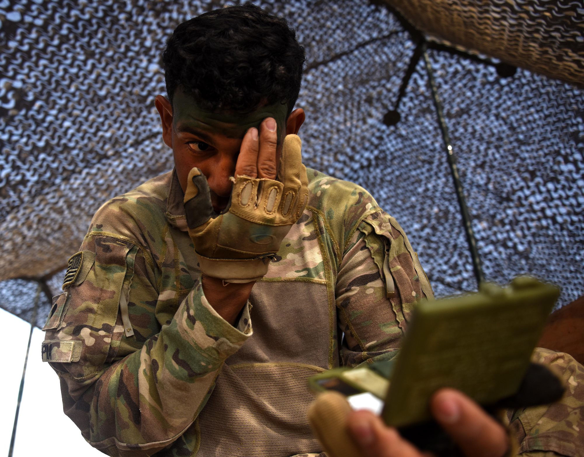 U.S. Army Spc. Eddie Tapia, Expert Infantry Badge candidate, applies camouflage paint to his face March 31, 2016, during the patrolling portion of the EIB course at Camp Lemonnier, Djibouti. Besides painting their faces and covering equipment with burlap, candidates ensured shiny or brightly colored objects were removed to prevent giving away their position. (U.S. Air Force photo by Staff Sgt. Kate Thornton)