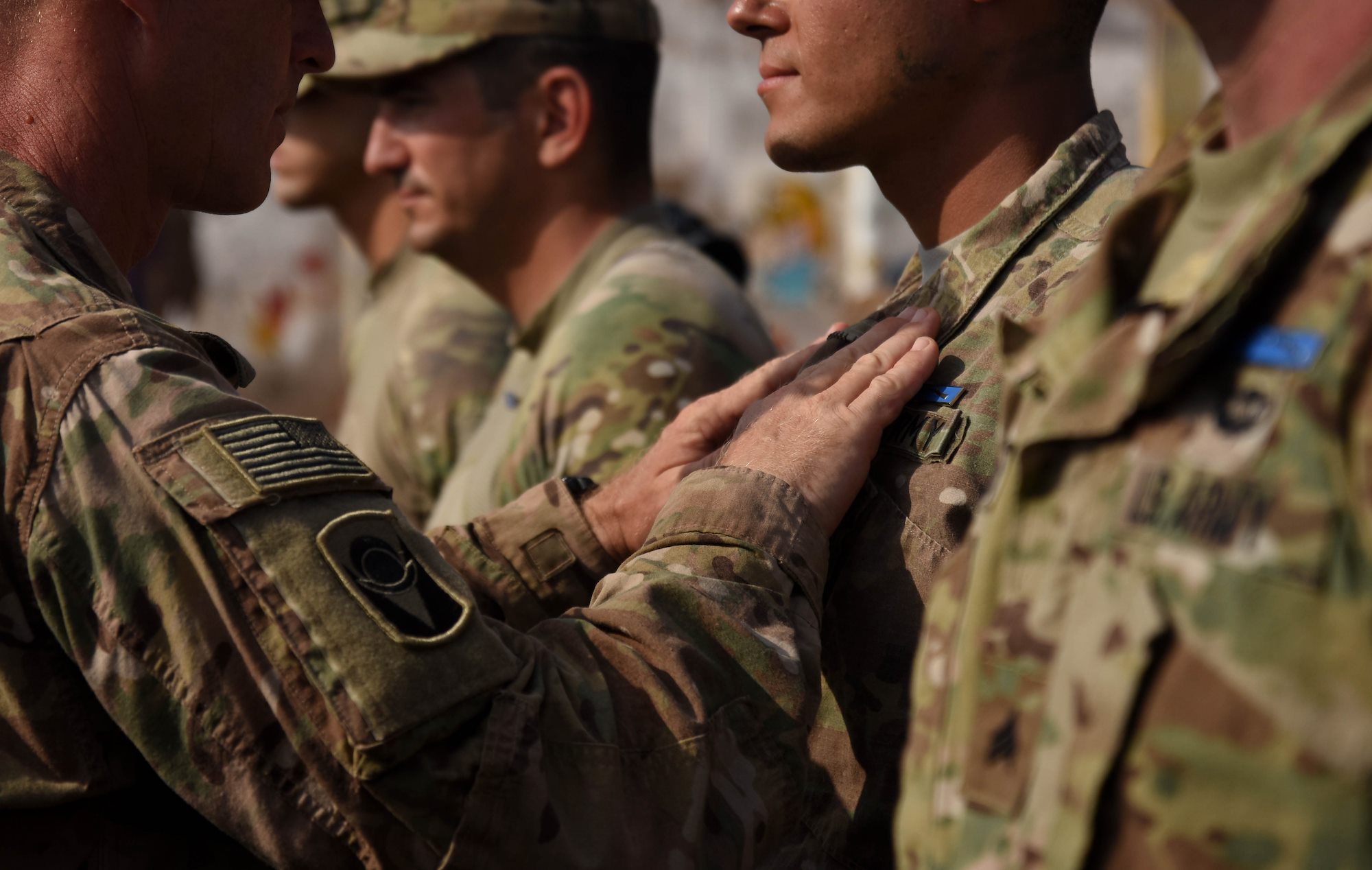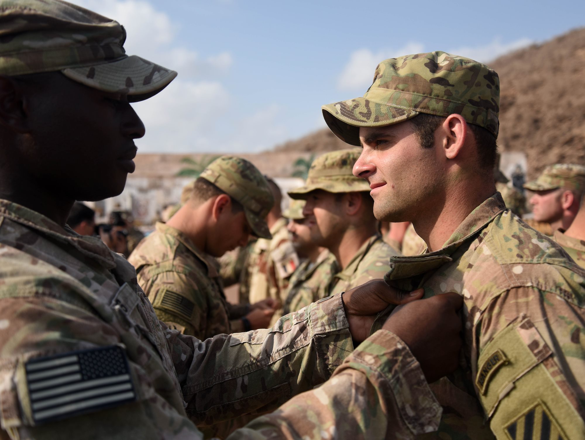 U.S. Army cadres pin badges on Soldiers during an Expert Infantry Badge pinning ceremony April 1, 2016, at Arta, Djibouti. The EIB signifies the most skilled infantry members, proving themselves masters of physical fitness, night and day land navigation, weapons, combat medical techniques, patrolling, a 12-mile road march, and the Objective Bull. (U.S. Air Force photo by Staff Sgt. Kate Thornton)