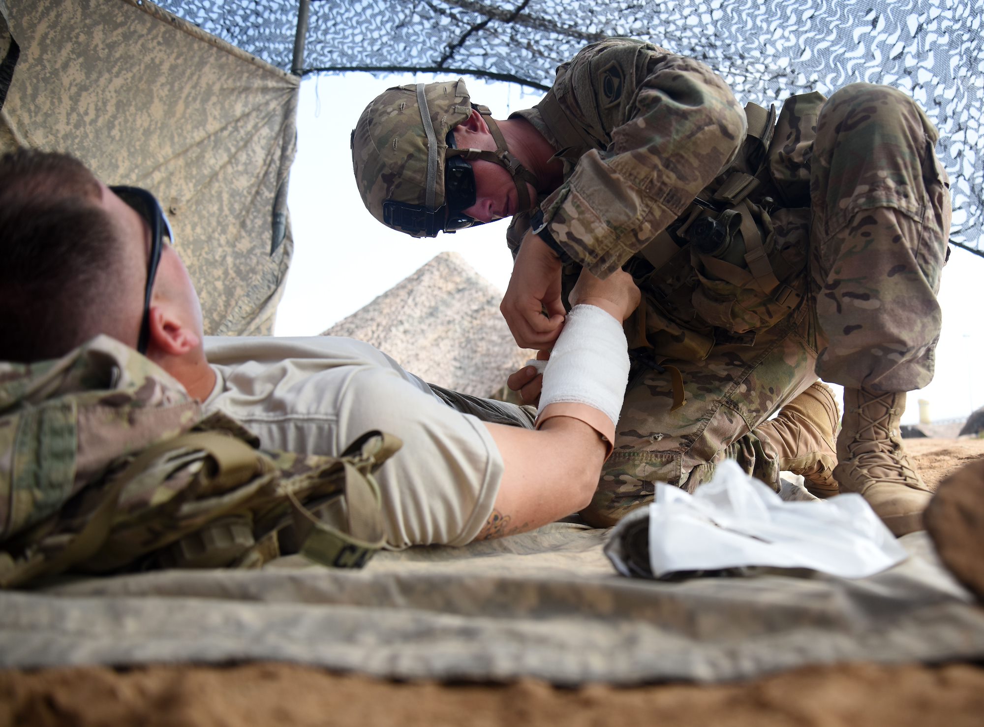A U.S. Army Expert Infantry Badge candidate treats a simulated burn March 30, 2016, during the medical portion of the EIB course at Camp Lemonnier, Djibouti. Each candidate was tested on a variety of medical issues that could happen in combat, ensuring they’re prepared to care for their fellow Soldiers in need. (U.S. Air Force photo by Staff Sgt. Kate Thornton)