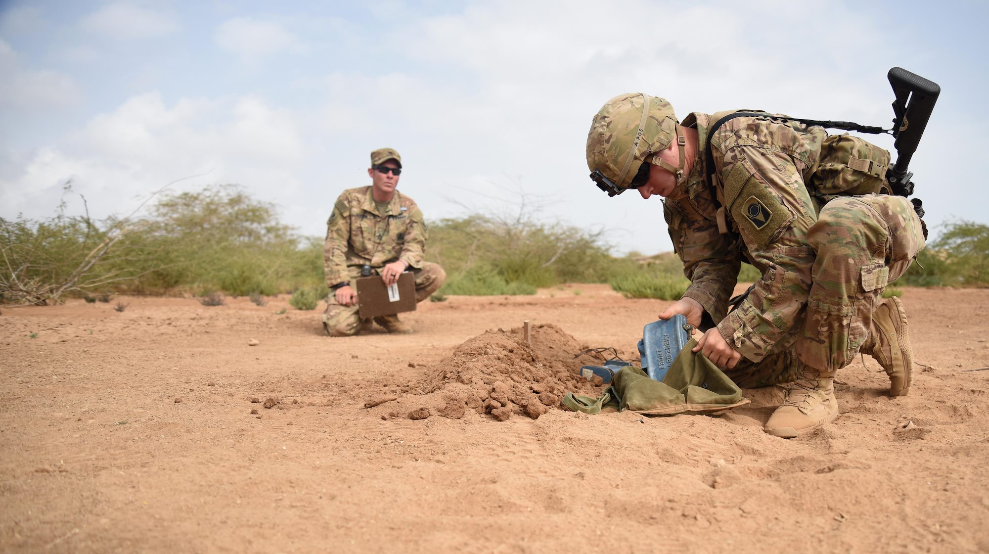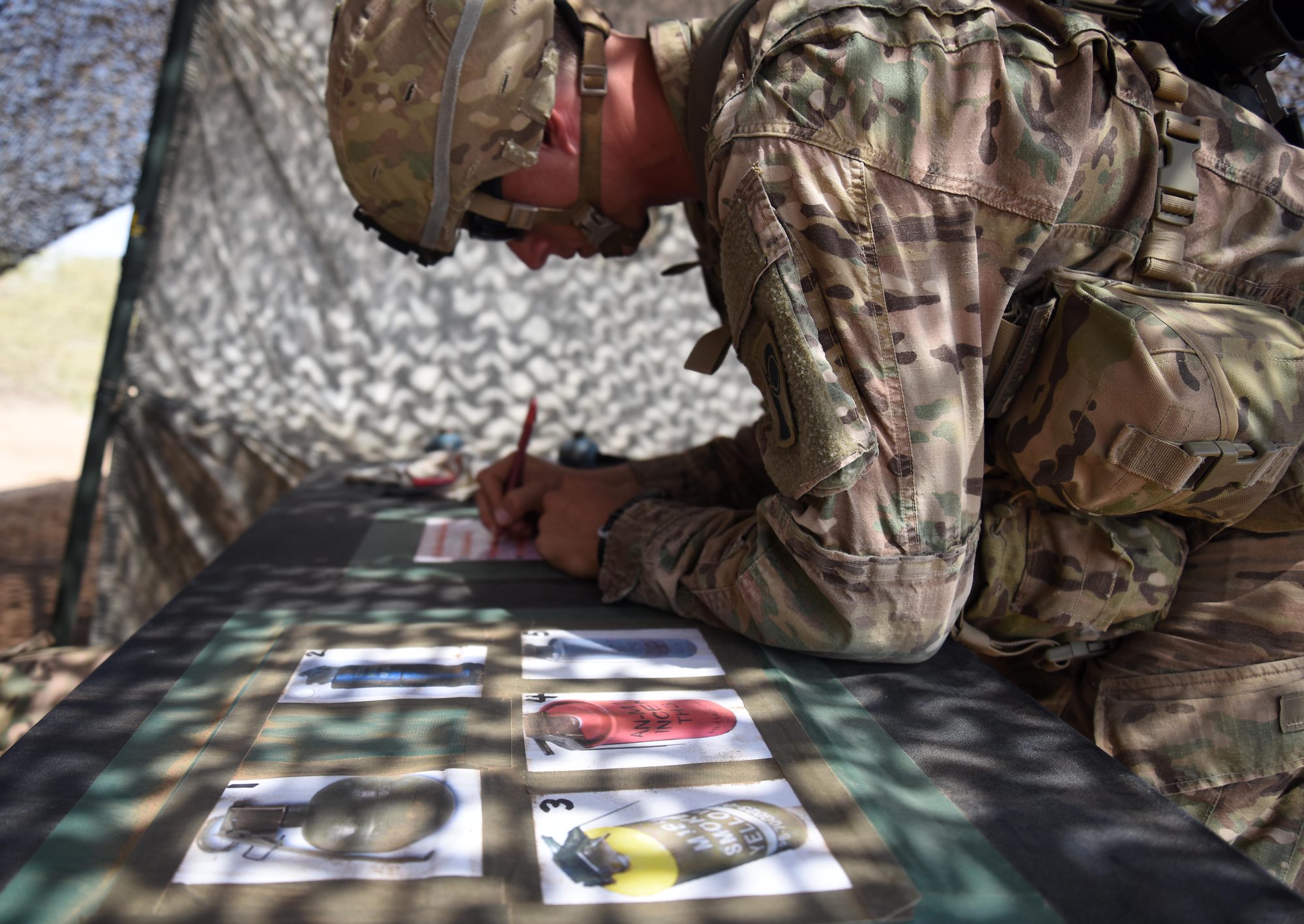 U.S. Army Expert Infantry Badge candidate completes a grenade classification test March 31, 2016, during the patrolling portion of the EIB course at Camp Lemonnier, Djibouti. After completing the grenade test, candidates had to complete two different grenade application tests where they threw them 35 feet and into a simulated enemy bunker. (U.S. Air Force photo by Staff Sgt. Kate Thornton)