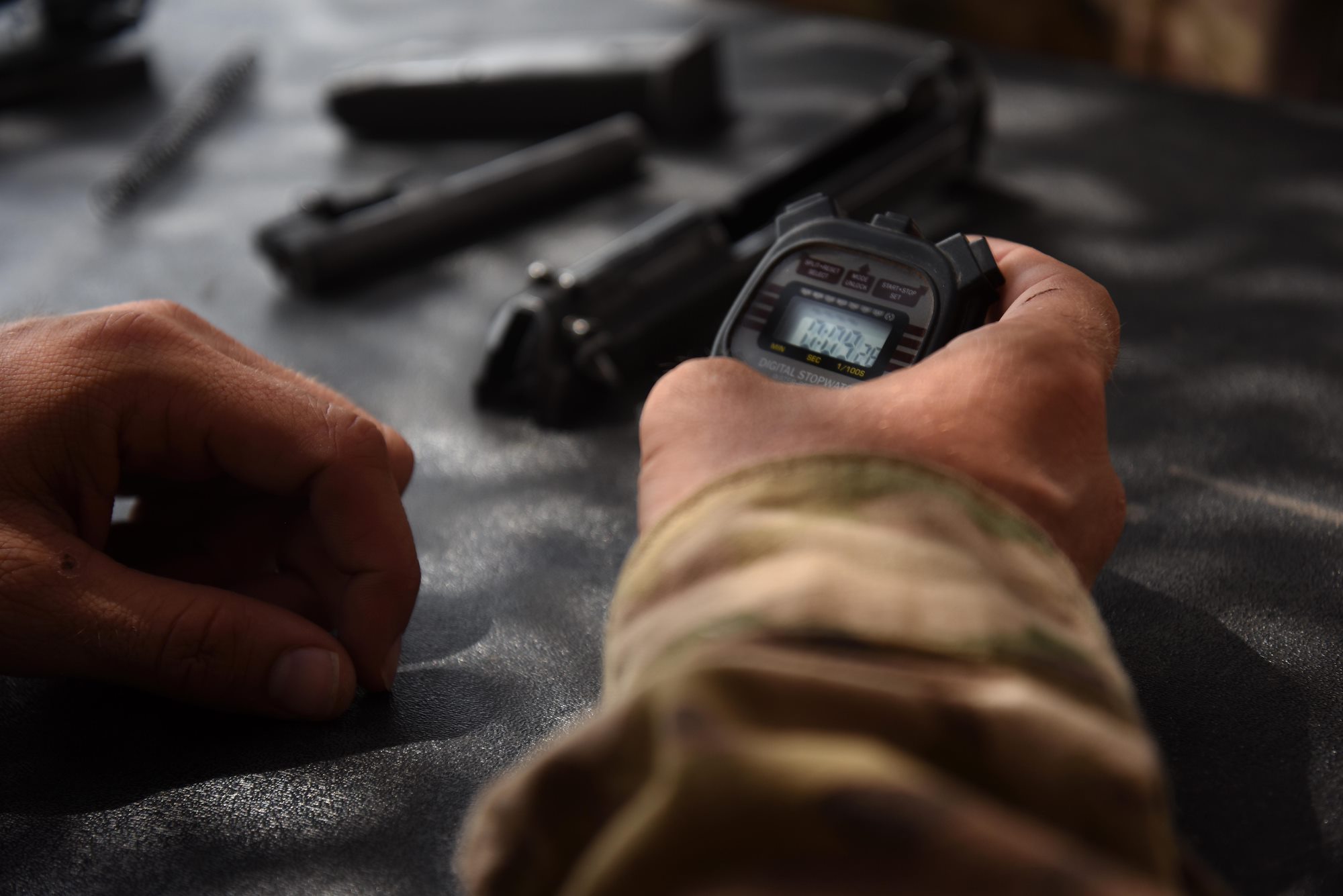A U.S. Army Expert Infantry Badge testing cadre times a candidate March 29, 2016, during the weapons portion of the EIB course at Camp Lemonnier, Djibouti. All of the events were timed, and as they moved through each day and each test, they received a “go” or “no go” indicating their status. (U.S. Air Force photo by Staff Sgt. Kate Thornton)