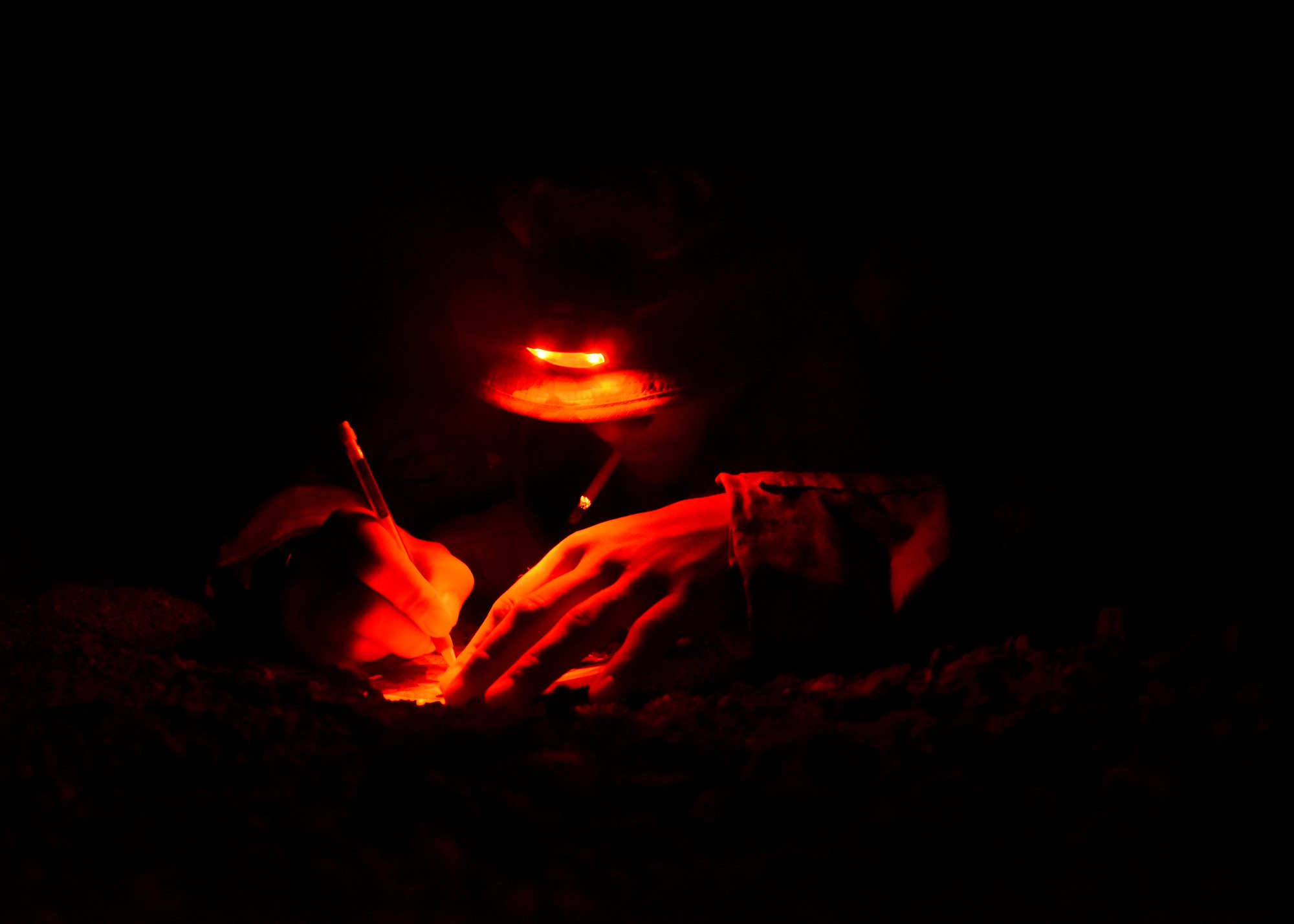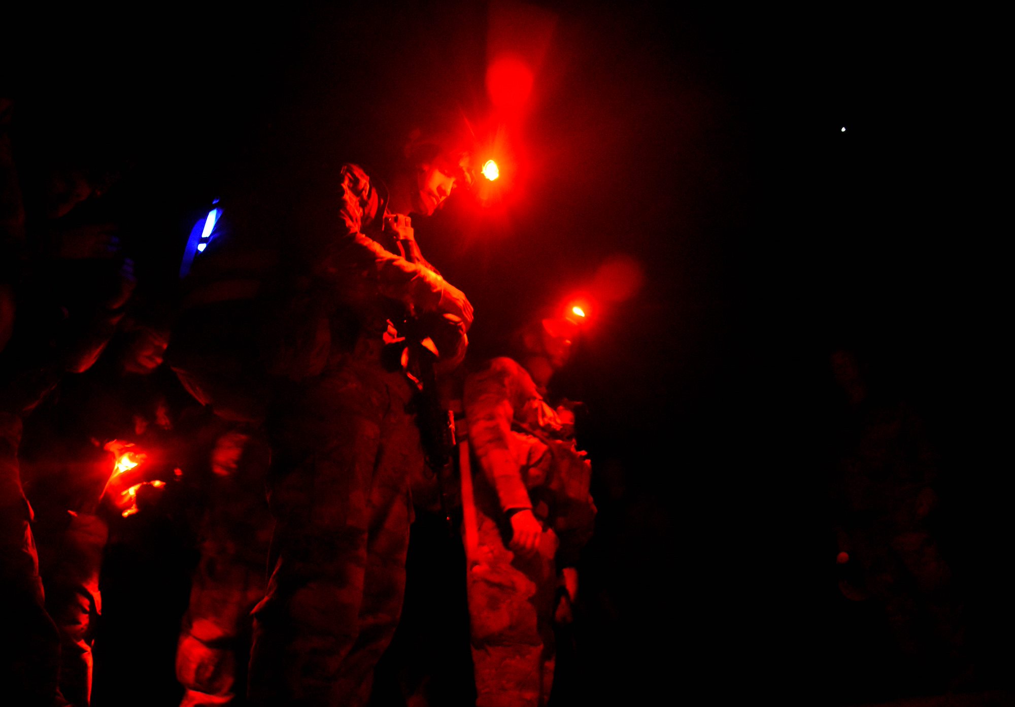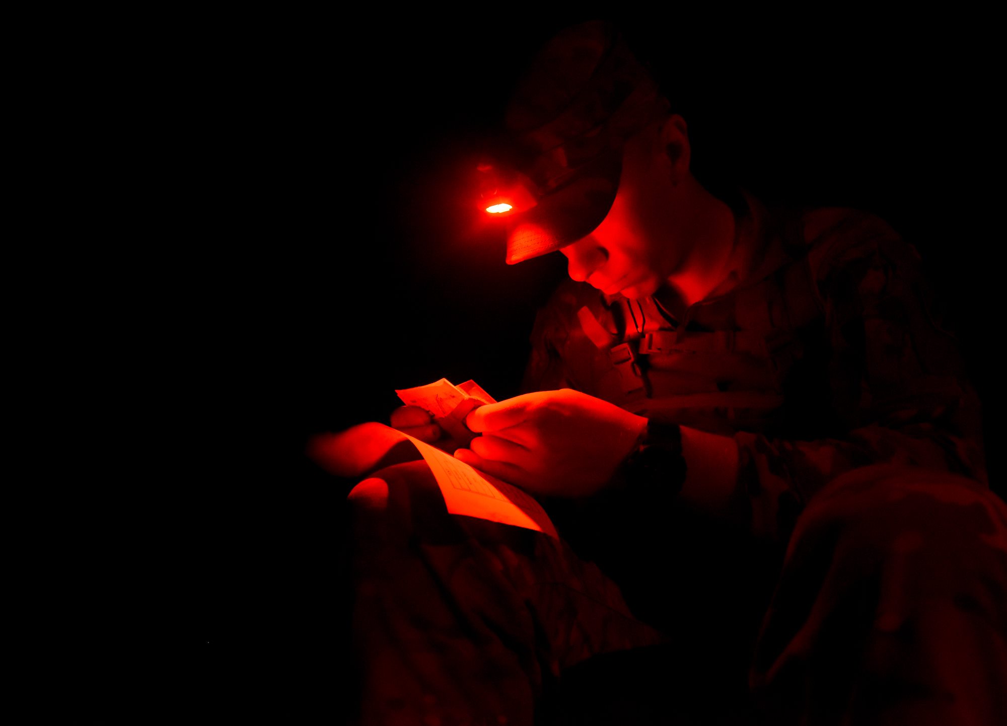 A U.S. Army Expert Infantry Badge candidate reads land navigation documents March 27, 2016, during the nighttime land navigation portion of the EIB course at Arta, Djibouti. Candidates had three hours to find three different points in the dark and rocky terrain of Arta using only their red light, map, protractor, and compass. (U.S. Air Force photo by Staff Sgt. Kate Thornton)