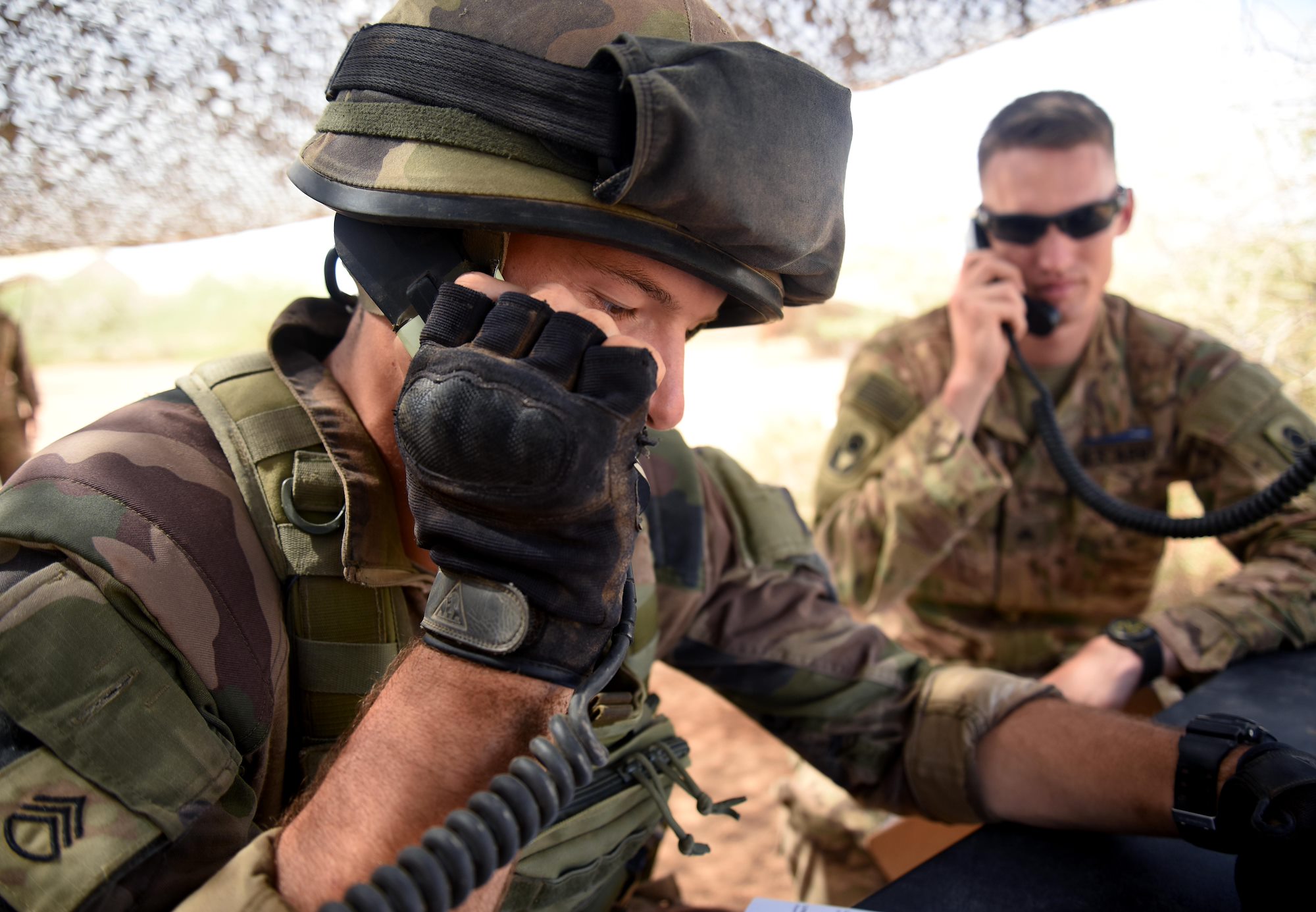 A French Army Soldier simulates calling in suspicious activity March 31, 2016, during the patrolling portion of the EIB course at Camp Lemonnier, Djibouti. The patrolling day included the most diverse categories of the course such as face paint, radio calls, hand signals and gas mask drills. (U.S. Air Force photo by Staff Sgt. Kate Thornton)