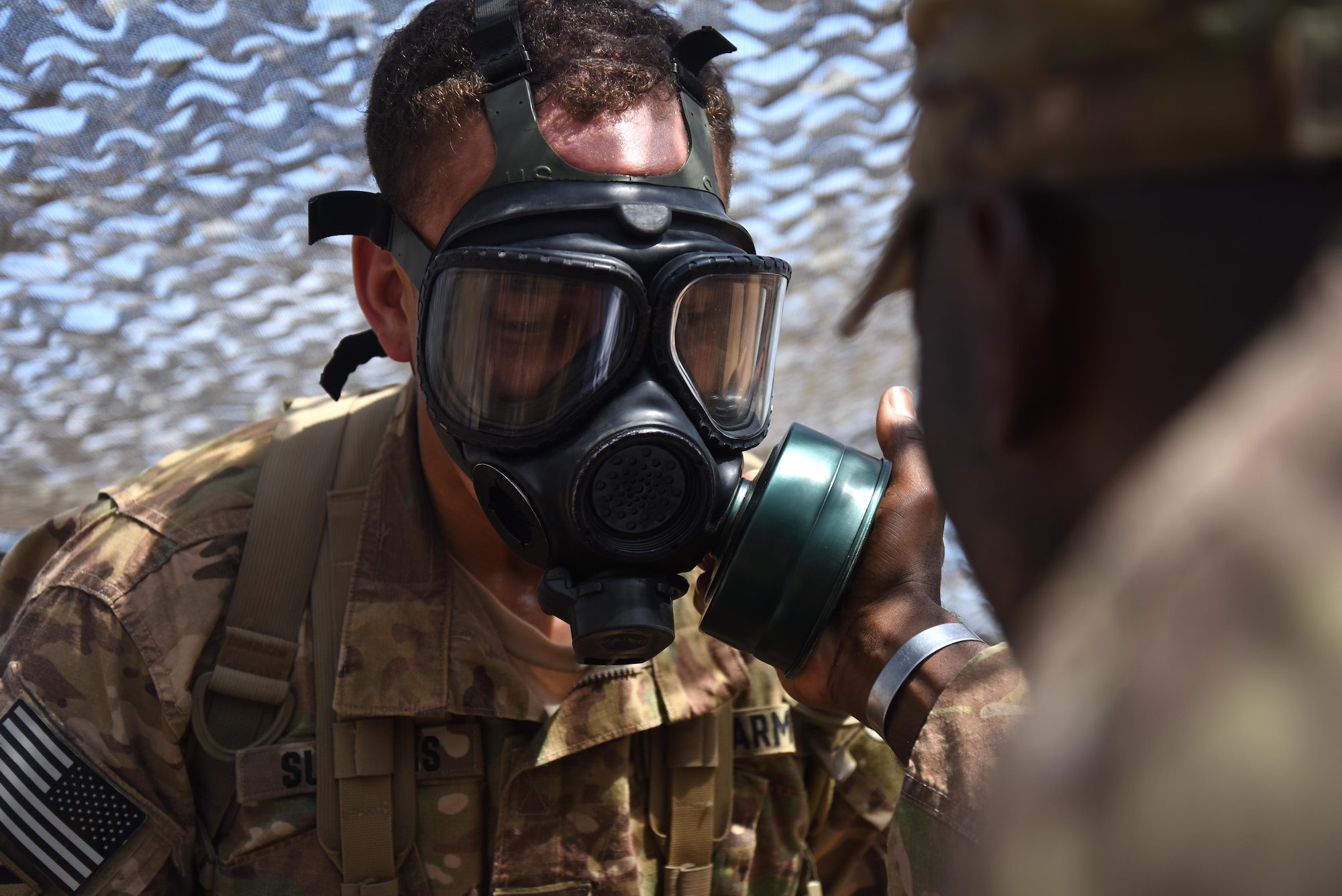 U.S. Army Expert Infantry Badge candidate completes a gas mask test March 31, 2016, during the patrolling portion of the EIB course at Camp Lemonnier, Djibouti. The patrolling day included the most diverse categories of the course such as face paint, radio calls, hand signals and gas mask drills. (U.S. Air Force photo by Staff Sgt. Kate Thornton)