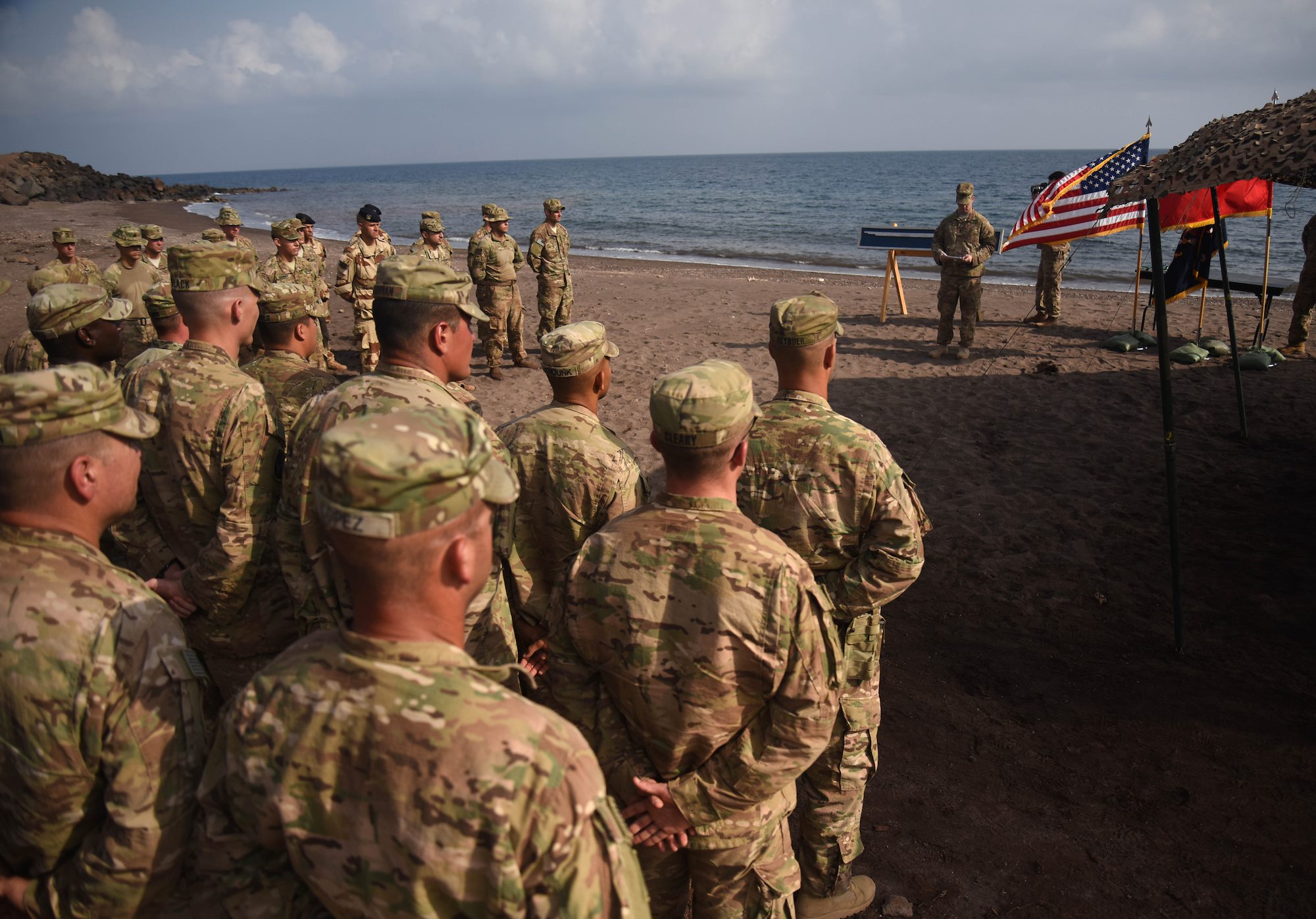 U.S. Army Soldiers walk into the ocean to celebrate completing an Expert Infantry Badge course April 1, 2016, at Arta, Djibouti. After completing the 12-mile ruck and Objective Bull, some candidates cooled down in the nearby water before changing their uniforms for the pinning ceremony. (U.S. Air Force photo by Staff Sgt. Kate Thornton)