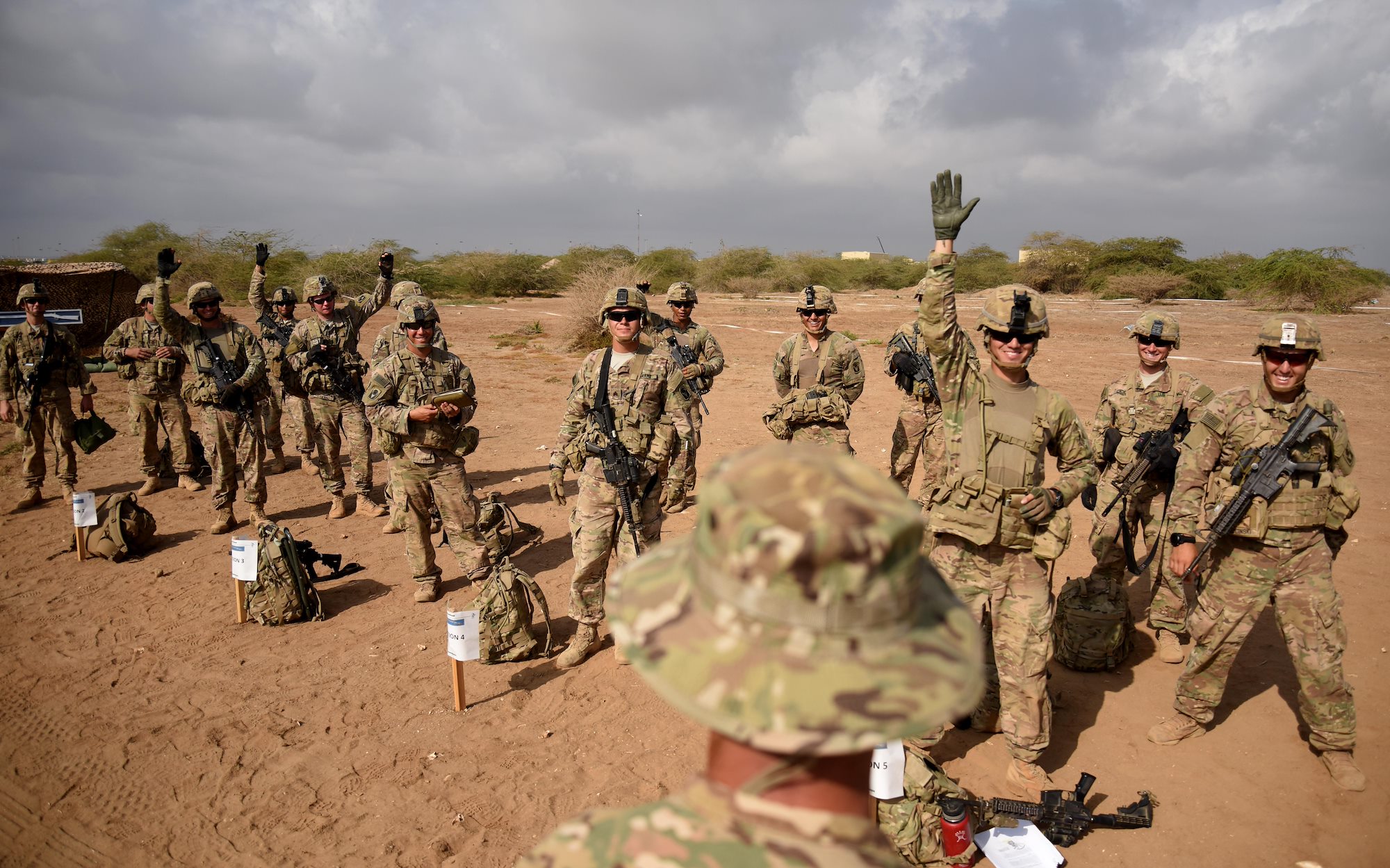 U.S. Army Soldiers indicate how they’re doing throughout an Expert Infantry Badge course March 31, 2016, at Camp Lemonnier, Djibouti. Starting with 119 Soldiers, the process stayed true to its vigorous and elite standards, eliminating 85 percent of skilled infantrymen throughout the week. (U.S. Air Force photo by Staff Sgt. Kate Thornton)