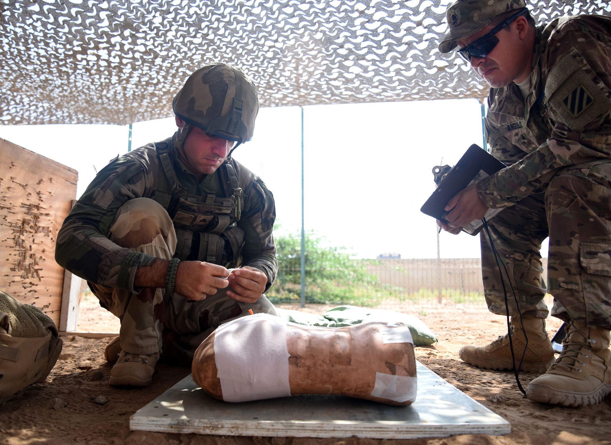 French Army Cpl. Timothy, Expert Infantry Badge candidate, treats a simulated patient while being evaluated March 30, 2016, during the medical portion of the EIB course at Camp Lemonnier, Djibouti. Since 1944, there haven’t been many changes to the EIB process, but this course proved different in more ways than one as several French infantrymen also participated. (U.S. Air Force photo by Staff Sgt. Kate Thornton)