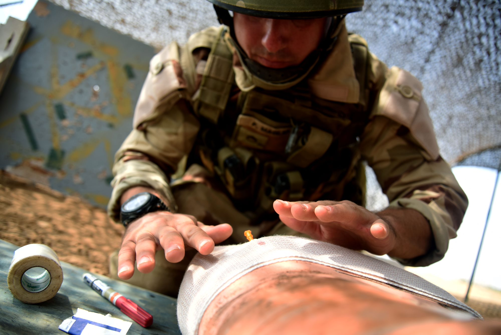 French Army Sgt. Florian Expert Infantry Badge candidate, treats a simulated patient March 30, 2016, during the medical portion of the EIB course at Camp Lemonnier, Djibouti. Since 1944, there haven’t been many changes to the EIB process, but this course proved different in more ways than one as several French infantrymen also participated. (U.S. Air Force photo by Staff Sgt. Kate Thornton)
