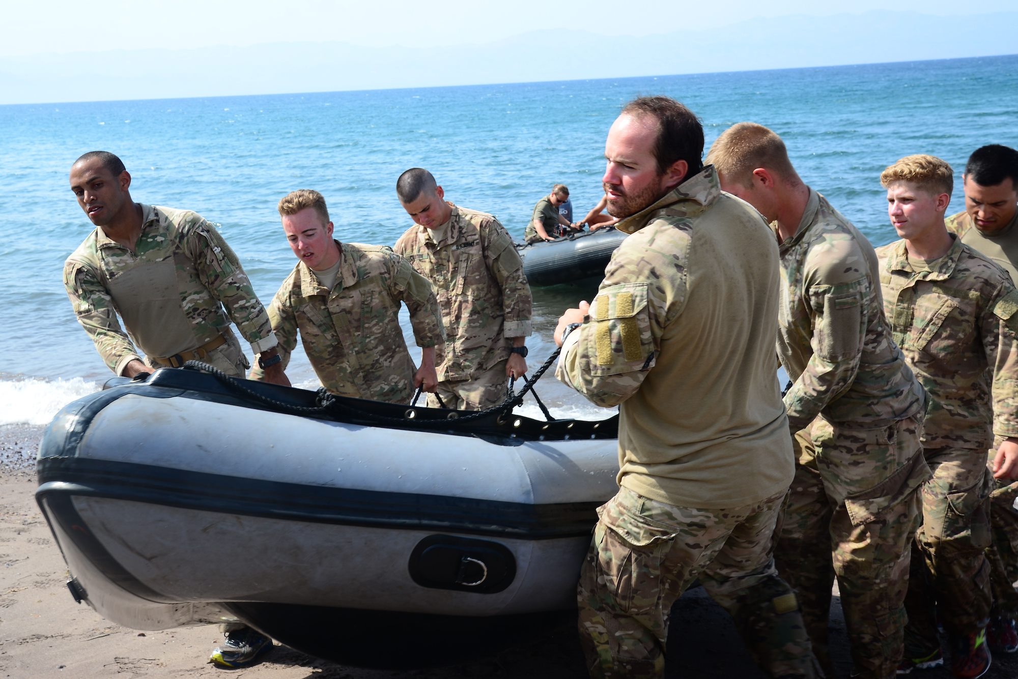 U.S. Army soldiers from the 2nd Battalion, 124th Infantry Regiment, carry a zodiac watercraft across a beach during a water crossing exercise May 5, 2016, at Arta Plage, Djibouti. The soldiers were required to run the watercraft across a beach, paddle to a drowning victim, and run back and run back to the starting point. (U.S. Air Force photo by Senior Airman Benjamin Raughton/Released)