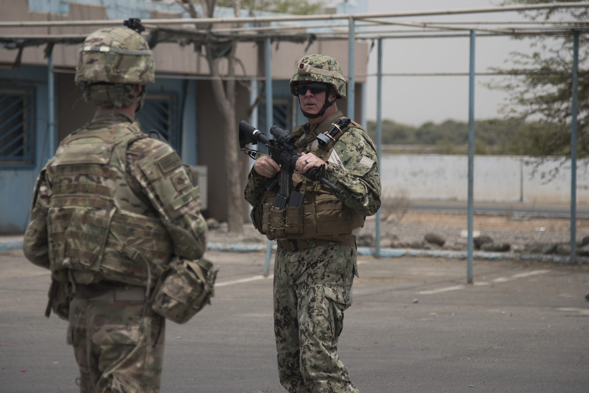 DJIBOUTI- U.S. Navy sailors with Coastal Riverine Squadron Eight, assigned to Combined Joint Task Force-Horn of Africa, provide security for a pier side U.S. asset on June 27, 2016, in Djibouti. CRS-8, out of Naval Station Newport, R.I., secures U.S. ships coming in and out of the port, and provides additional security during the ships’ in-port stay. (U.S. Air Force photo by Staff Sgt. Tiffany DeNault)