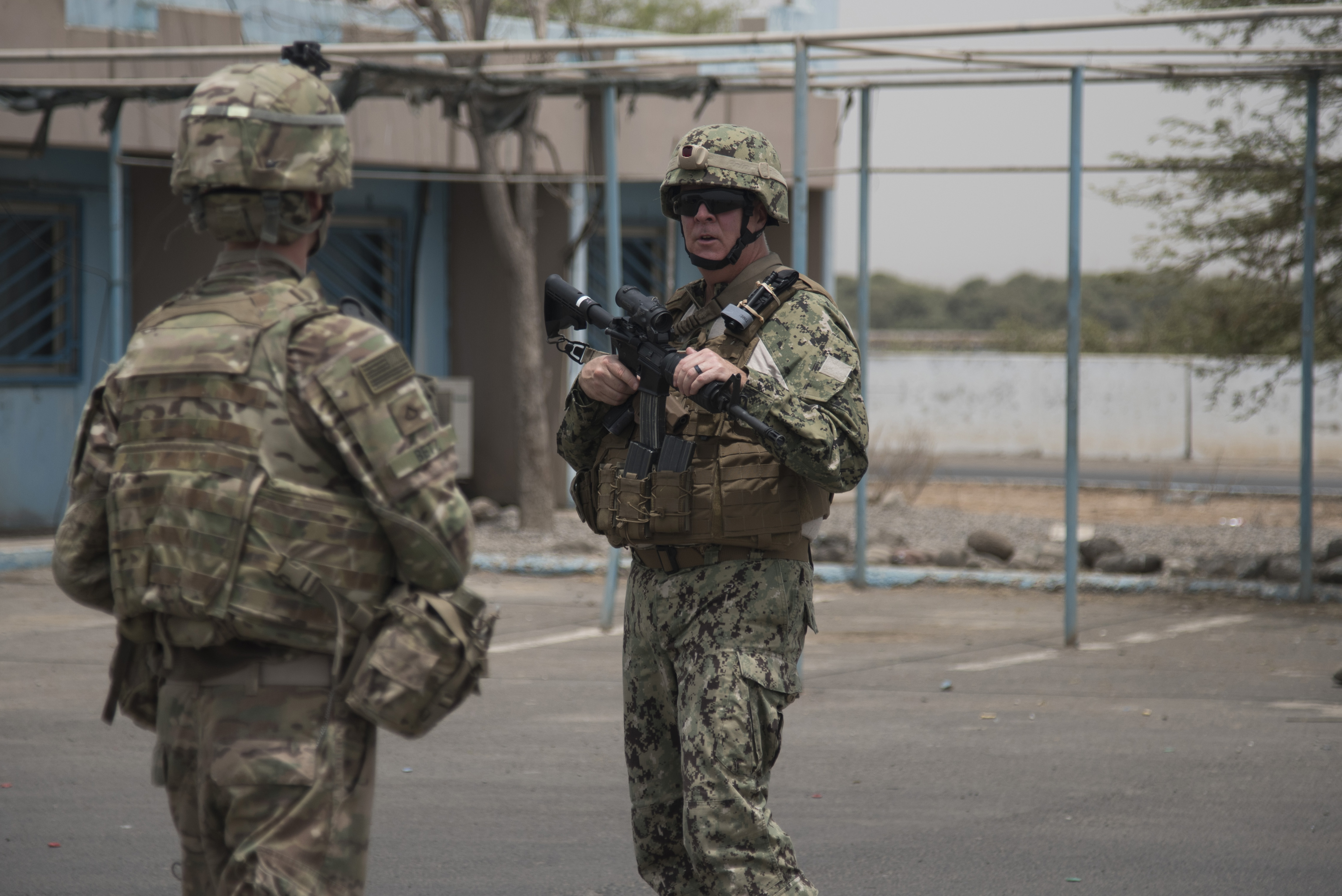 DJIBOUTI, Djibouti- U.S. Army Private 1st Class David Betz, 1st Battalion, 124th Infantry Division rifleman and U.S. Navy Petty Officer 2nd Class Kurt Grell, Coastal Riverine Squadron Eight logistics specialist, both of whom are assigned to Combined Joint Task Force-Horn of Africa, provide security while U.S. Navy SeaArk Dauntless patrol boats are collected from a pier, June 29, 2016, in Djibouti. The 1/124th Inf. Rgt, in coordination with the CRS-8, regularly secures the pier area while collecting and dropping off U.S. Navy patrol boats. (U.S. Air Force photo by Staff Sgt. Tiffany DeNault)