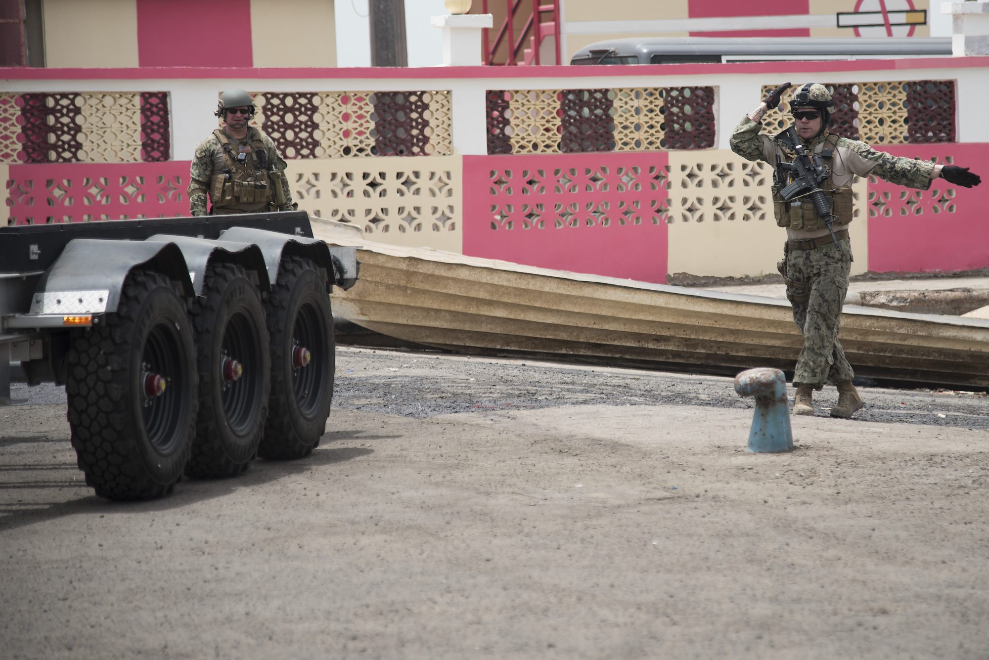 DJIBOUTI– U.S. Navy Petty Officer 3rd Class Scott Graham, Coastal Riverine Squadron Eight aviation machinist mate assigned to Combined Joint Task Force-Horn of Africa, directs a truck into a loading dock to recover U.S. Navy SeaArk Dauntless patrol boats, June 29, 2016, in Djibouti. In coordination with the 1st Battalion, 124th Infantry Regiment, the patrols boats are safely collected from the pier and escorted back to Camp Lemonnier, Djibouti. (U.S. Air Force photo by Staff Sgt. Tiffany DeNault)
