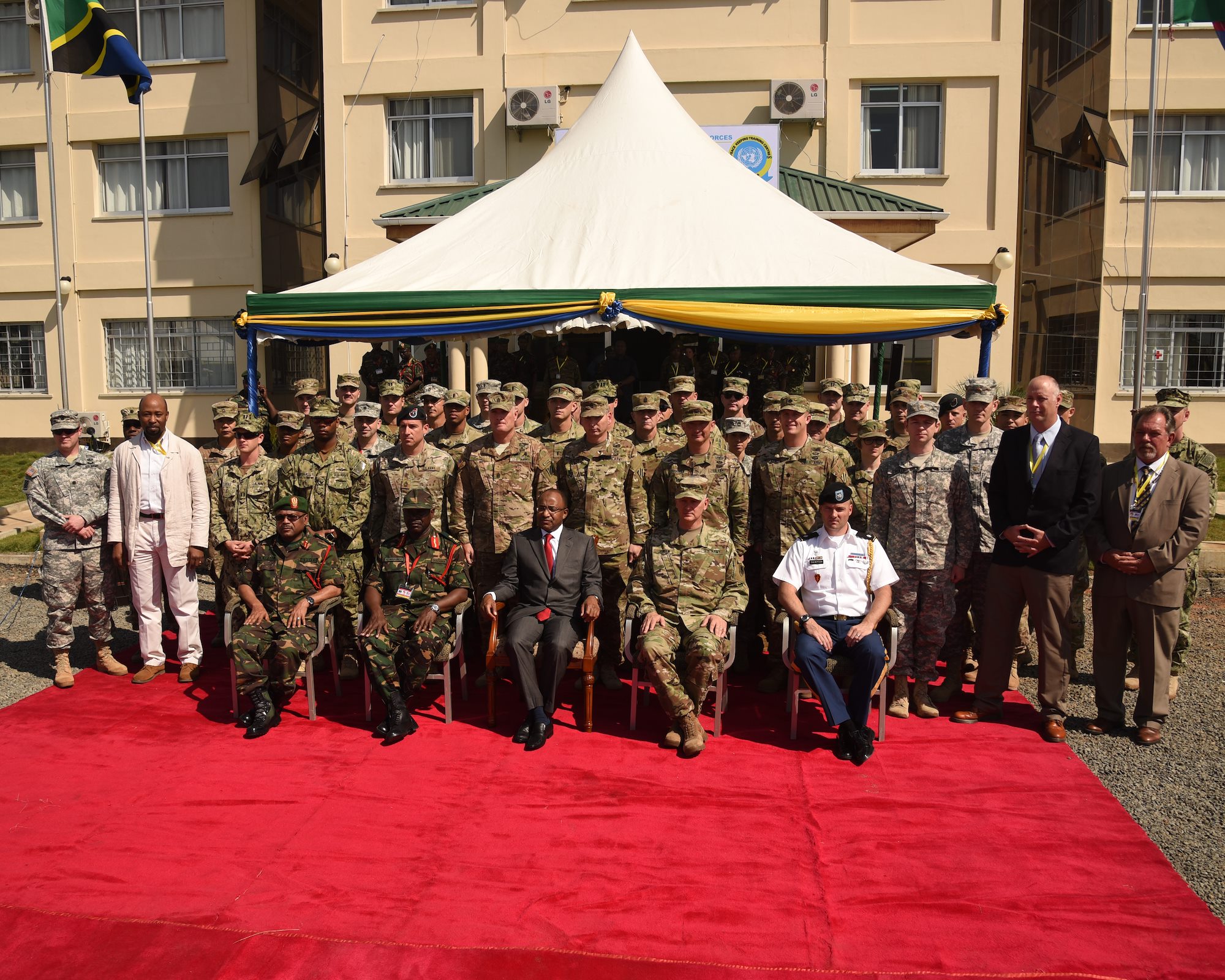 DAR ES SALAAM, Tanzania – Senior military leaders and Hussein Ali Mwyini, Minister of Defense and National Service, take a group photograph with the U.S. Eastern Accord 2016 participants at the Opening Ceremony at the Tanzanian Peacekeeping Training Centre on July 11, 2016, in Dar es Salaam, Tanzania. EA16 is an annual, combined, joint military exercise that brings together partner nations to practice and demonstrate proficiency in conducting peacekeeping operations. (U.S. Air Force photo by Staff Sgt. Tiffany DeNault)