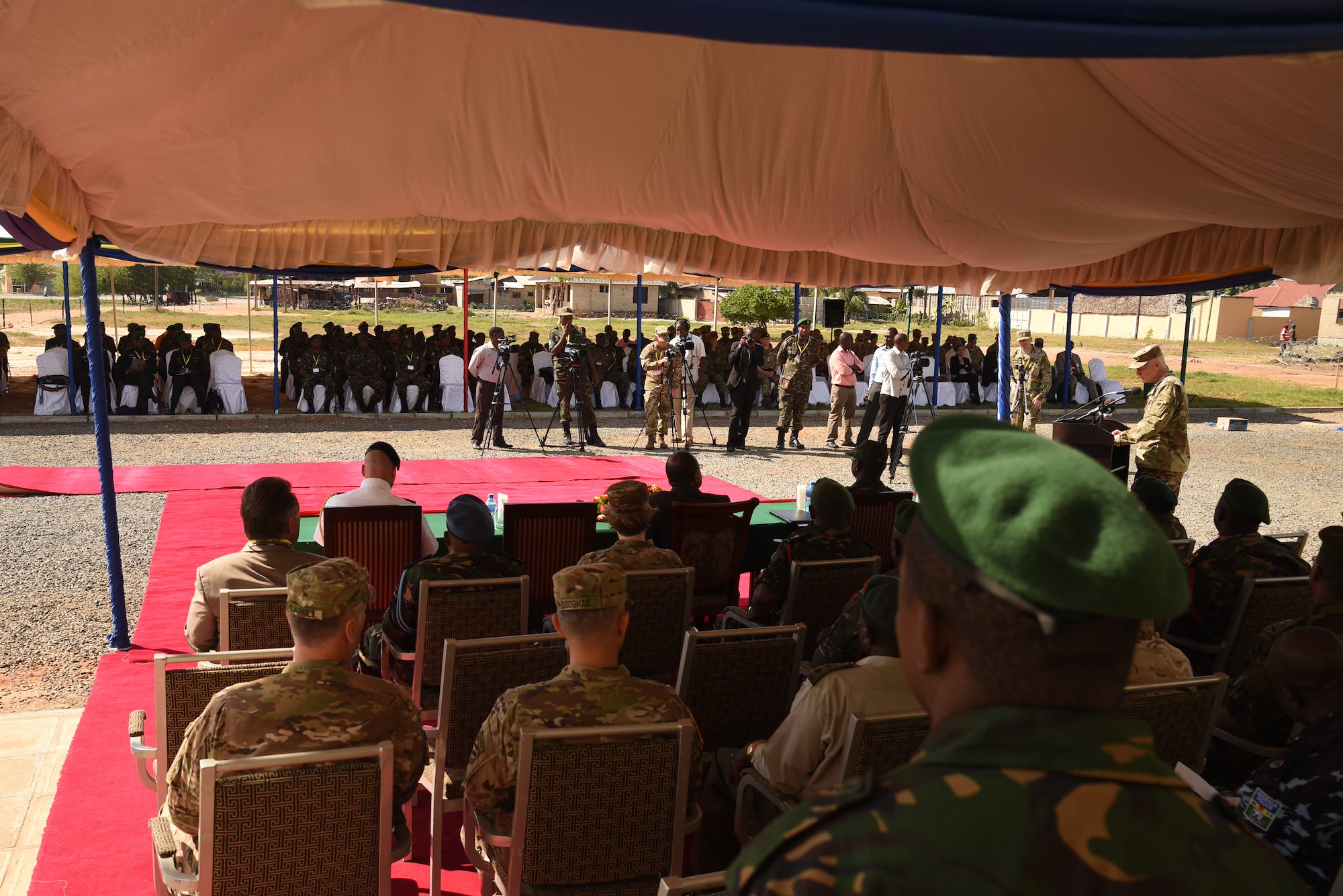 DAR ES SALAAM, Tanzania – Eastern Accord 2016 participants and honorary guests attend the command post exercise opening ceremony at the Tanzanian Peacekeeping Training Centre on July 11, 2016, Dar es Salaam, Tanzania. EA16 is an annual, combined, joint military exercise that brings together partner nations to practice and demonstrate proficiency in conducting peacekeeping operations. (U.S. Air Force photo by Staff Sgt. Tiffany DeNault)
