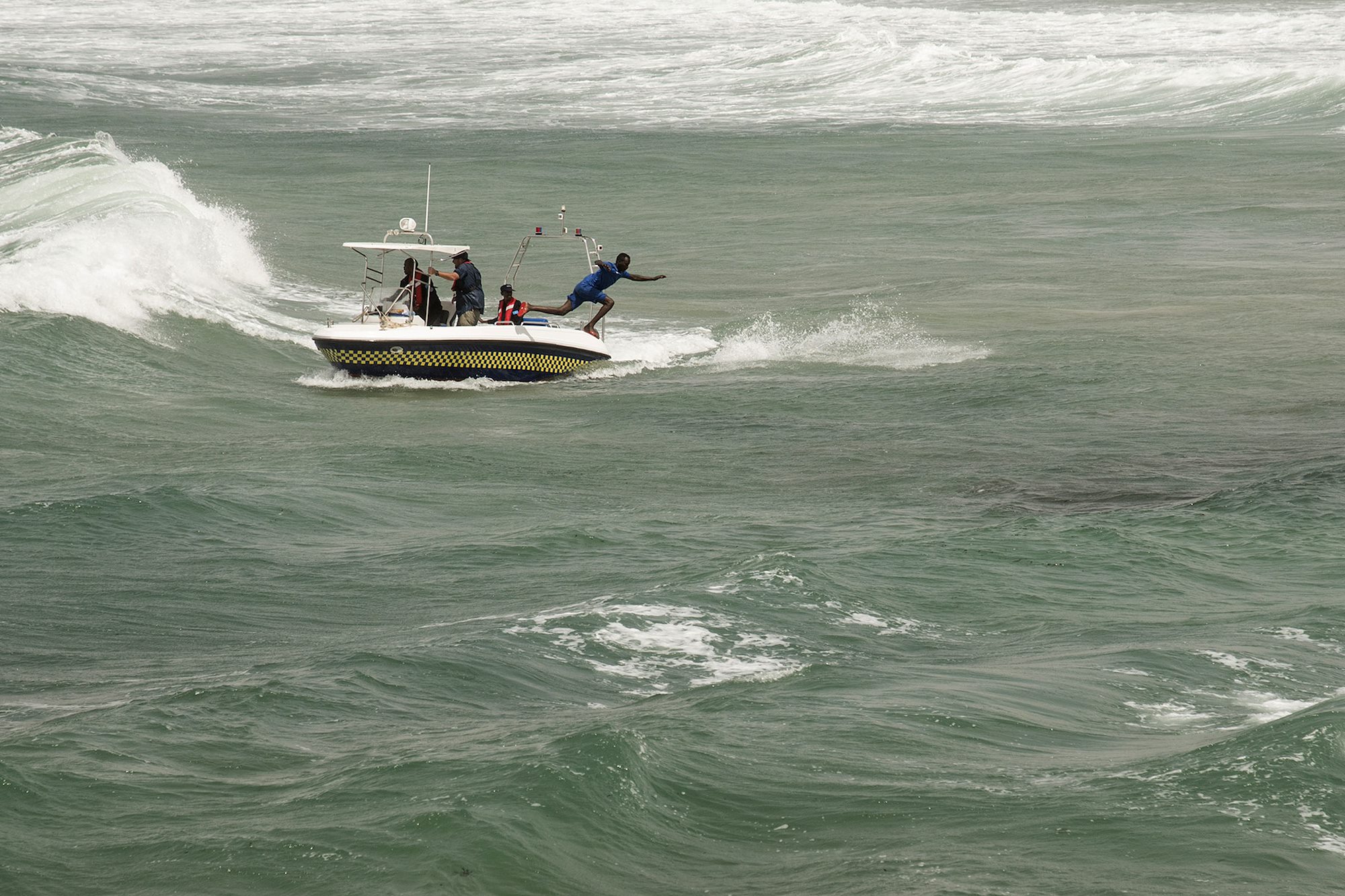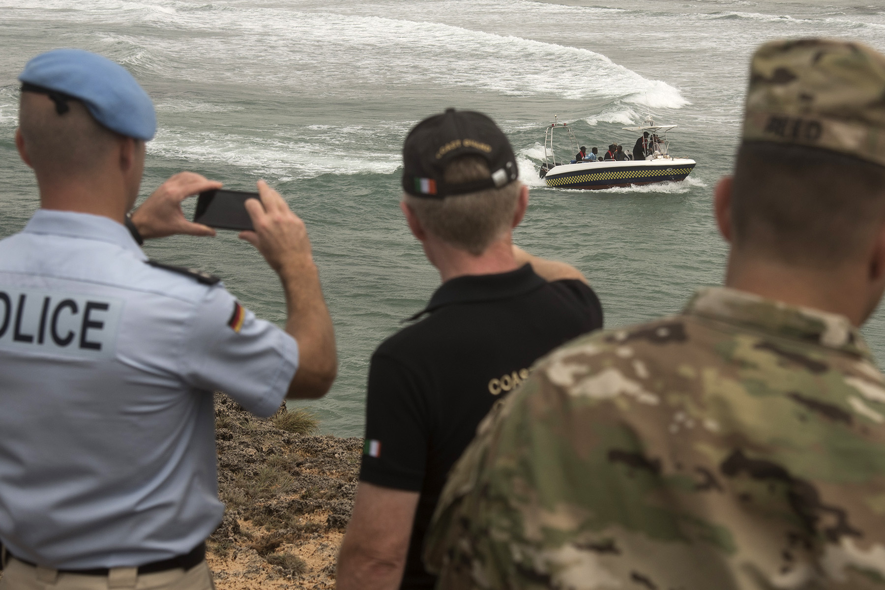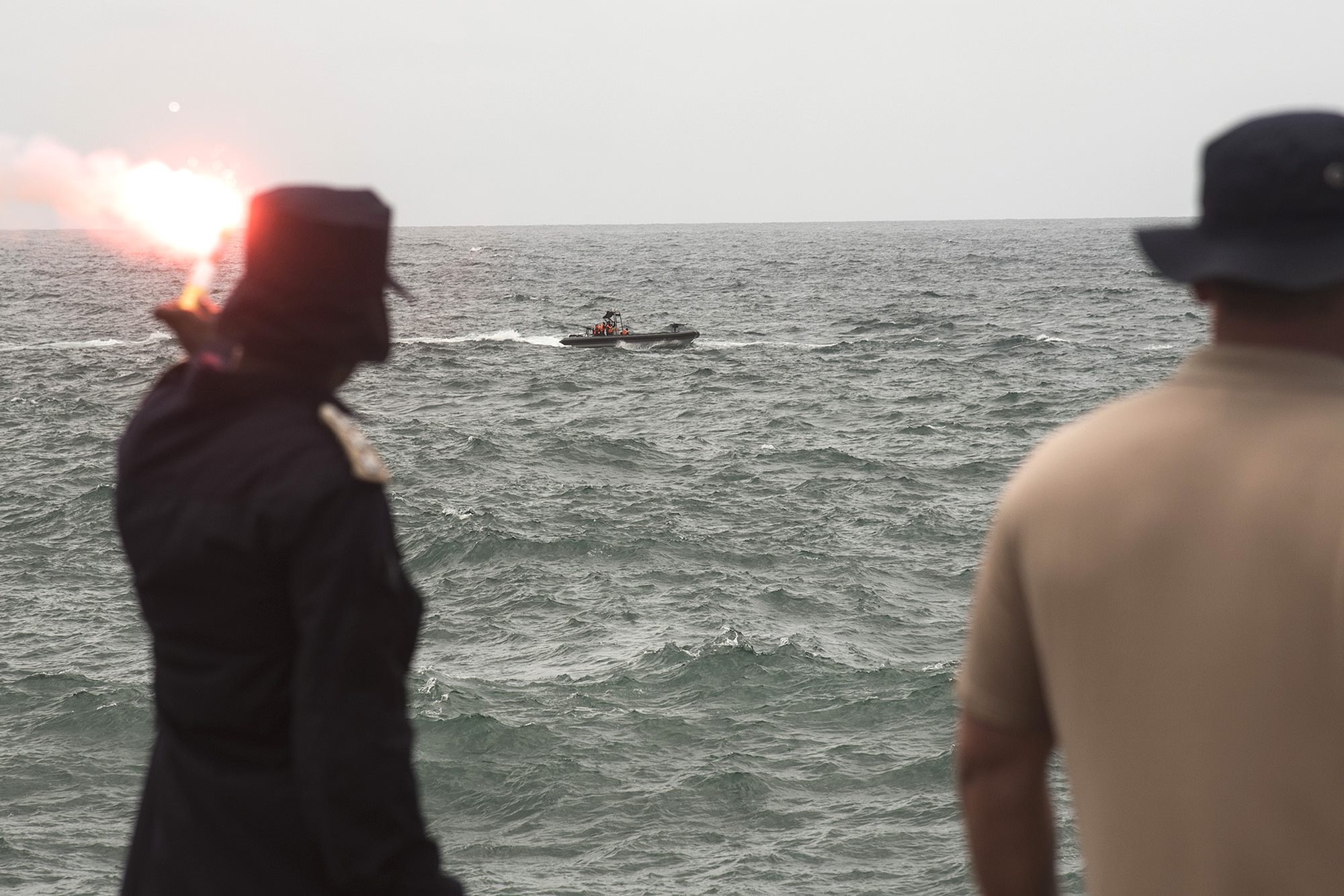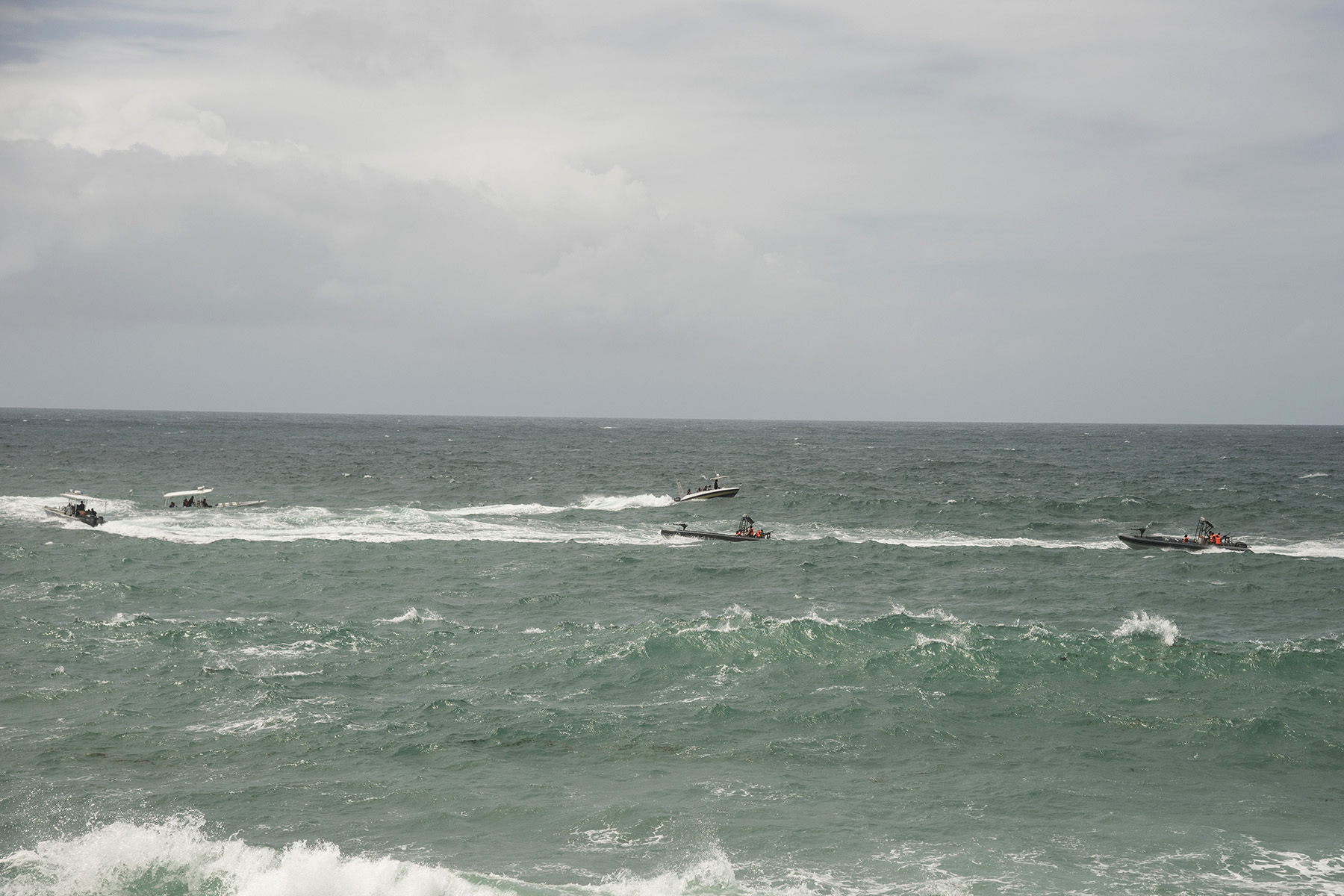 Five small boats with the Somali Police Force Maritime Police Unit conduct a maritime exercise demonstrating their capabilities off the coast of Mogadishu, Somalia. Representatives from approximately seven countries involved in improving security and stability in Somalia observed the demonstration Aug. 25, 2016. Trained by the United Nations Office on Drugs and Crime, the maritime police unit received two new vessels for training and interdiction operations around the coast of Somalia.