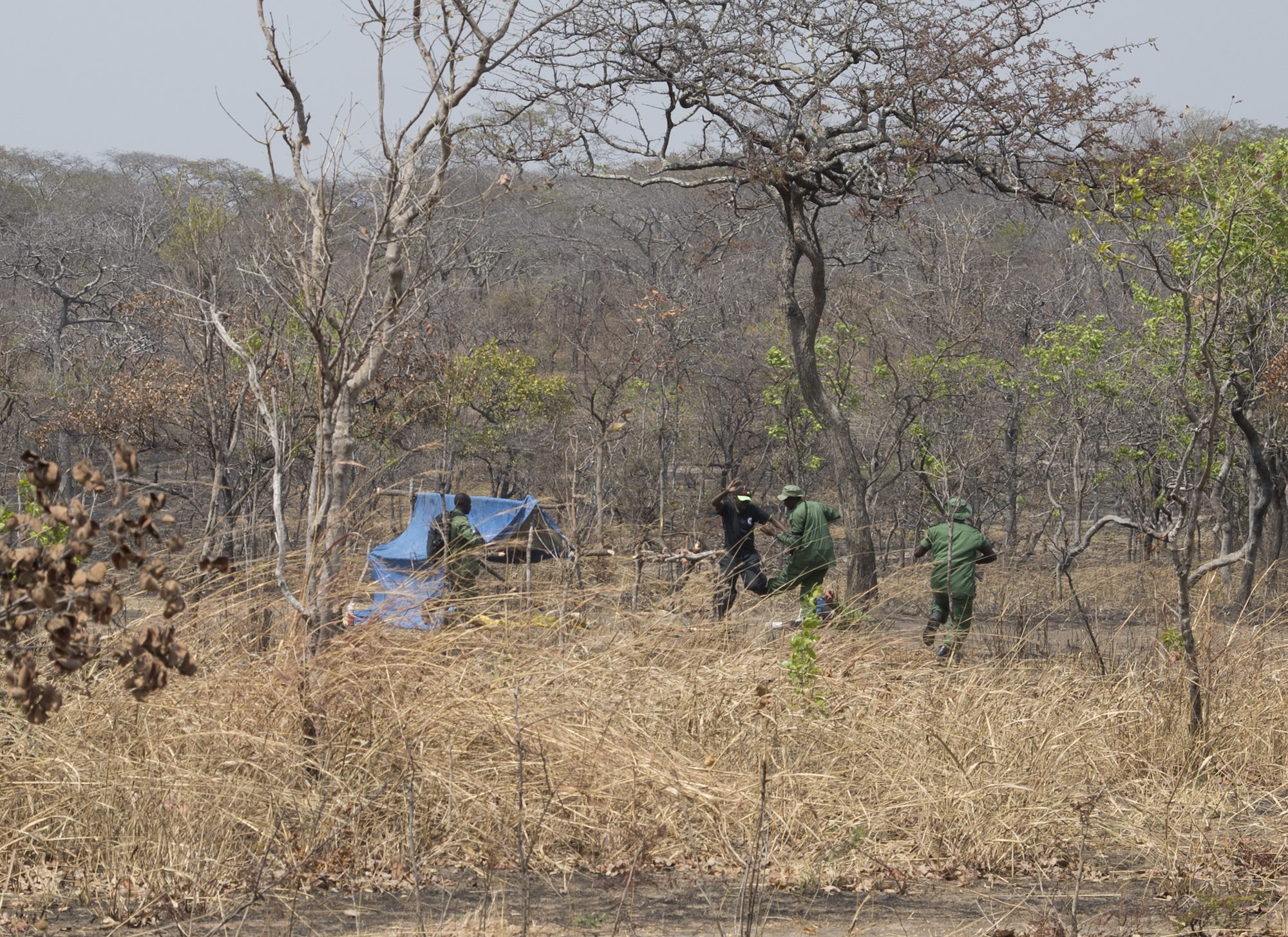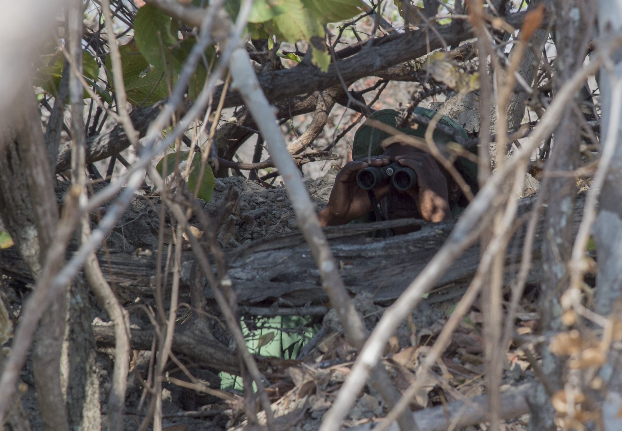 A Tanzanian game reserve ranger observes a simulated poacher camp and reports findings to headquarters during a demonstration August 24, 2016, at Rungwa Game Reserve, Tanzania. Rangers recently trained with members of the 403rd Civil Affairs Battalion, a component of Combined Joint Task Force - Horn of Africa, and North Carolina Army National Guard to learn techniques to track and capture poachers. (U.S. Air Force photo by Staff Sgt. Eric Summers Jr.)